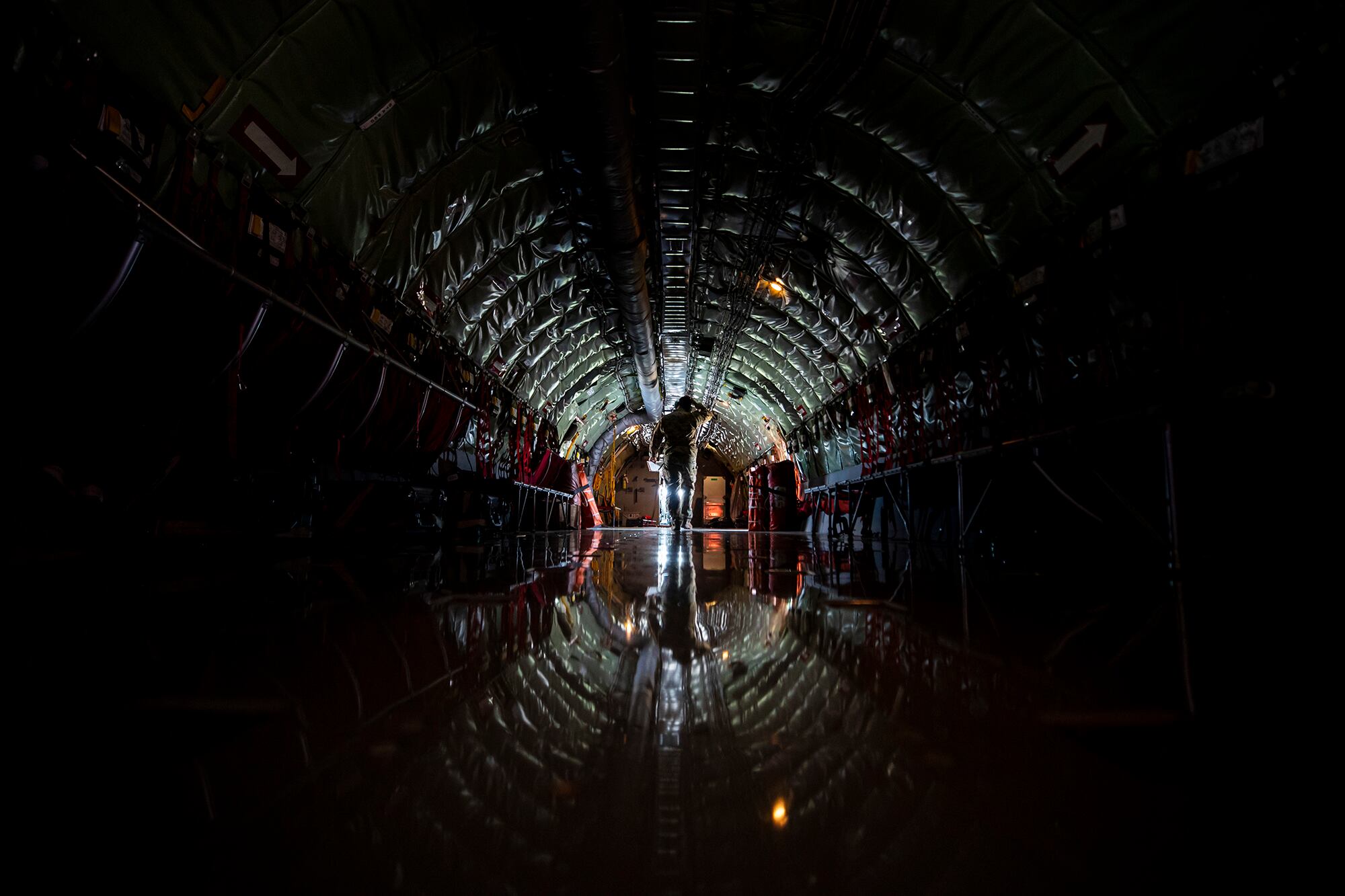 Tech. Sgt. Vince Stokes, 141st Air Refueling Squadron book operator, walks through a KC-135R Stratotanker at Fairchild Air Force Base, Wash., May 6, 2021. (Master Sgt. Matt Hecht/Air National Guard)