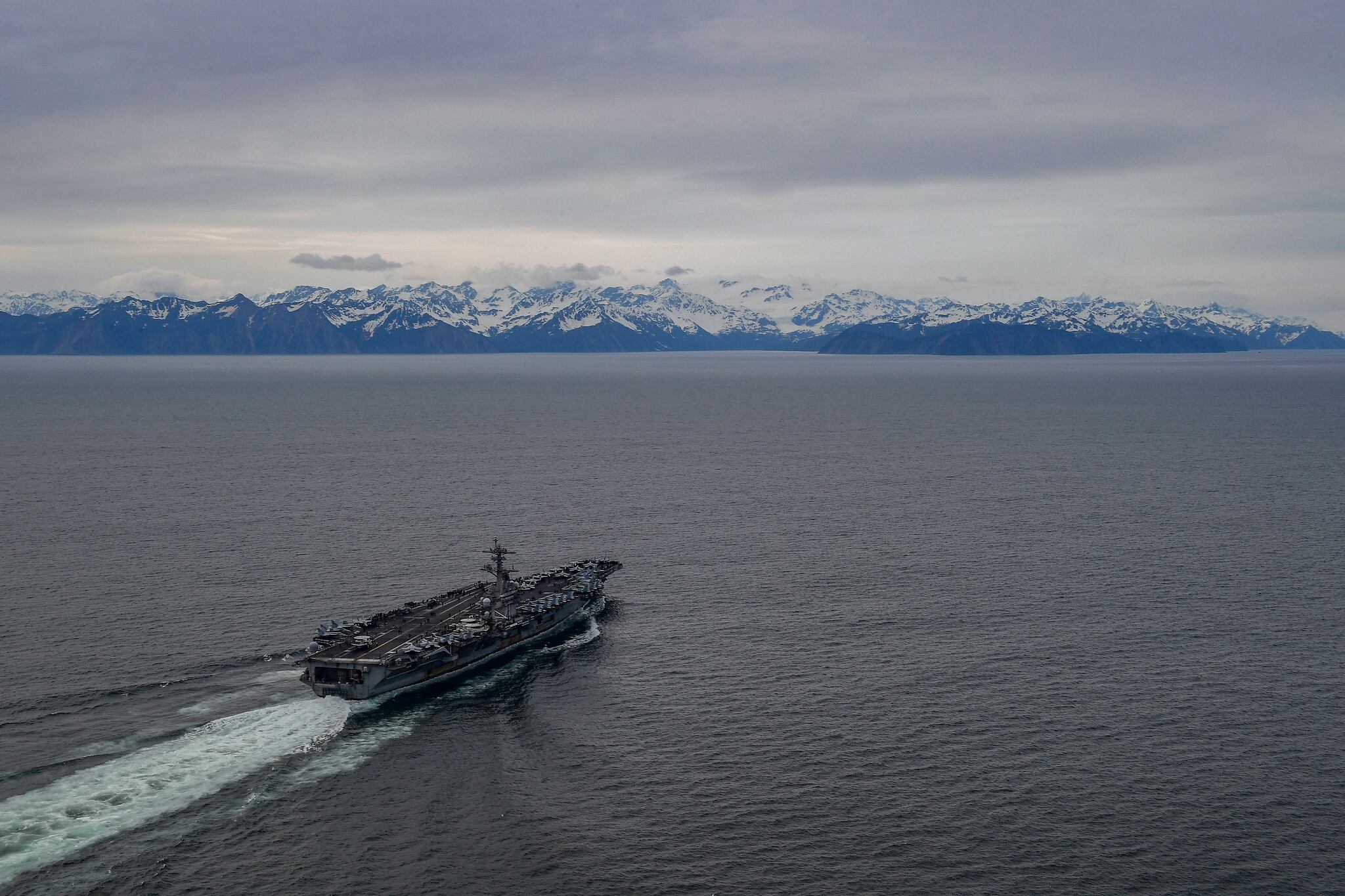The aircraft carrier USS Theodore Roosevelt (CVN 71) transits the Gulf of Alaska, May 7, 2021, in support of flight operations above the Joint Pacific Alaska Range Complex and Gulf of Alaska during Exercise Northern Edge 2021 (NE21). (MC3 Brandon Richardson/Navy)