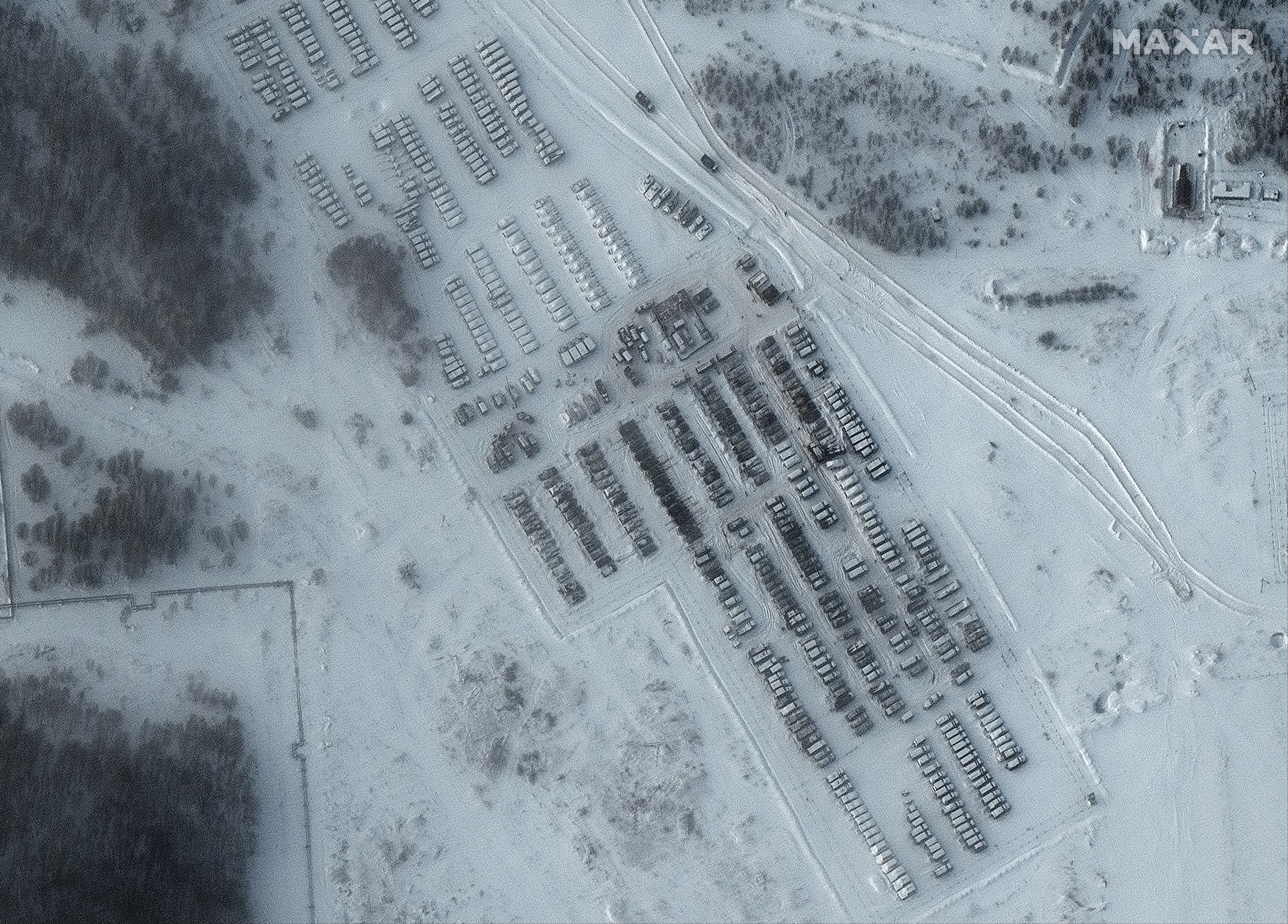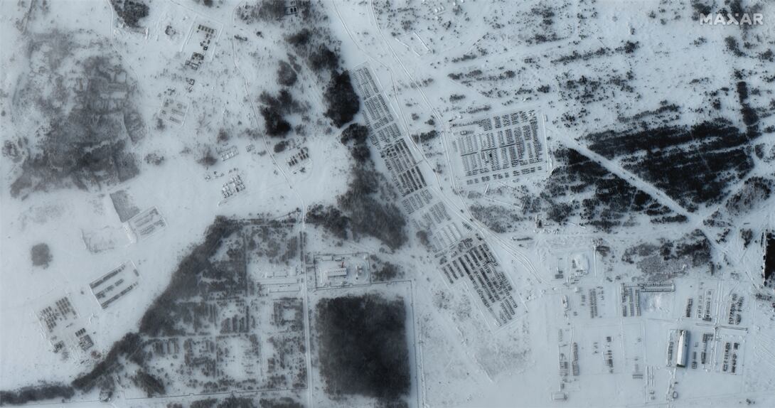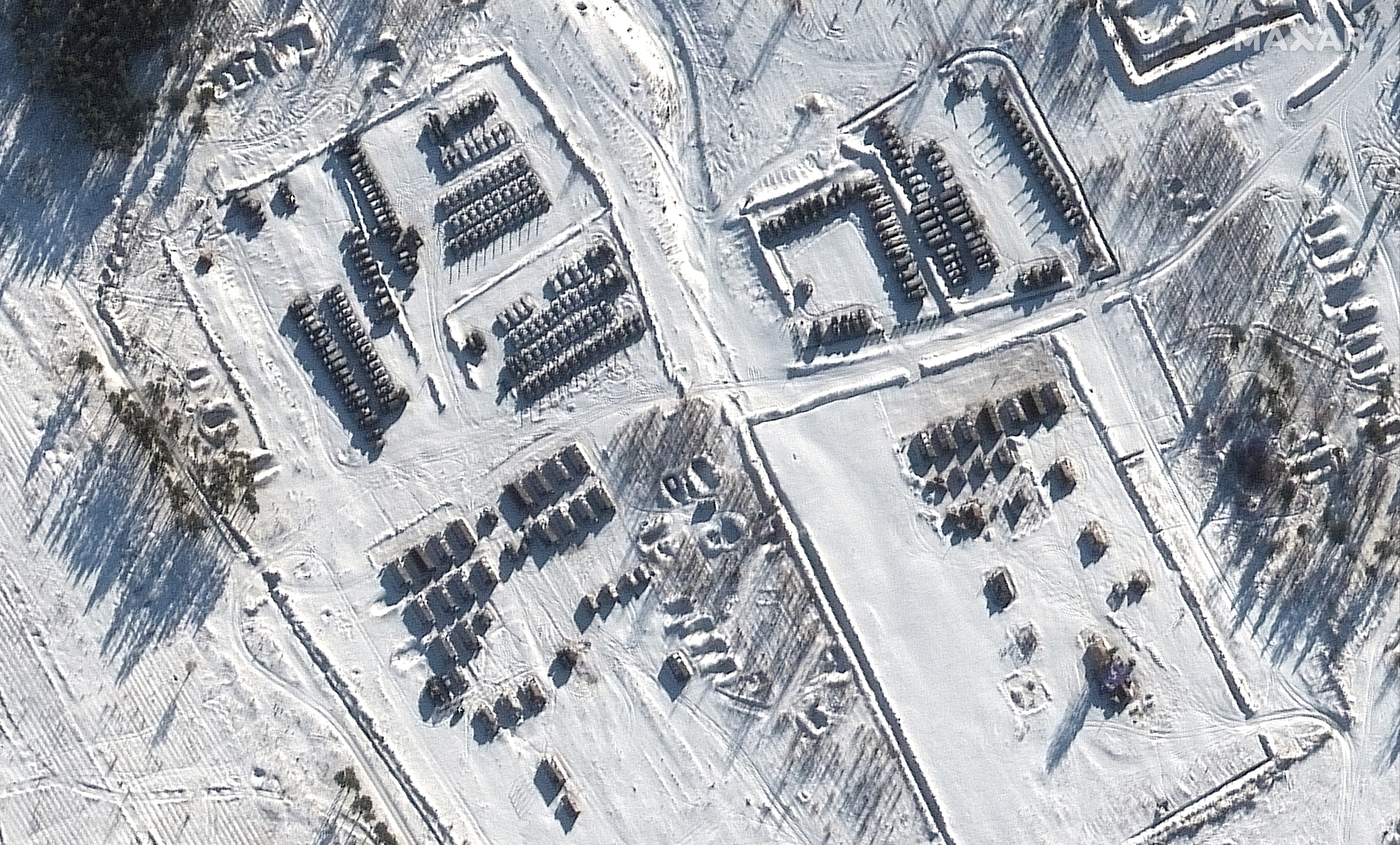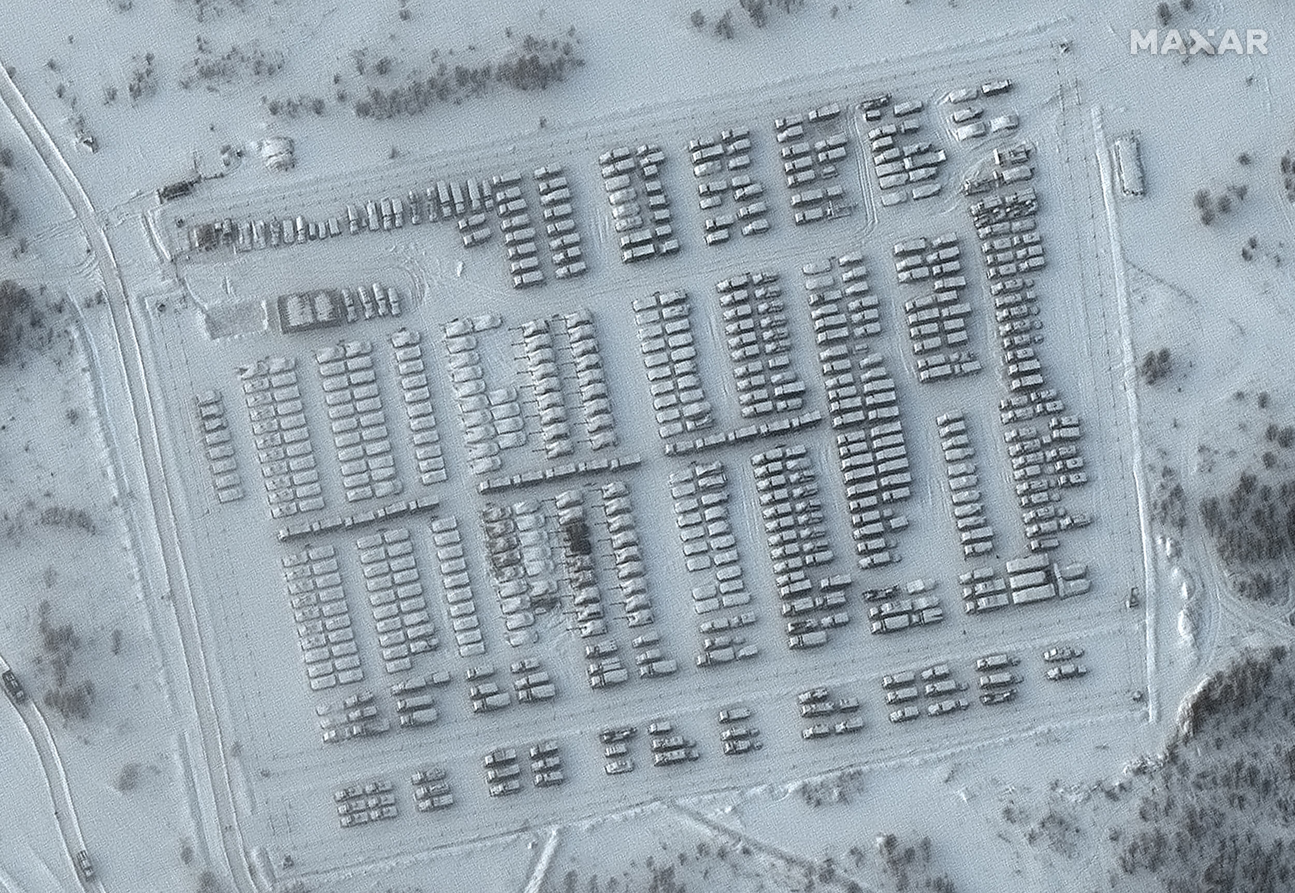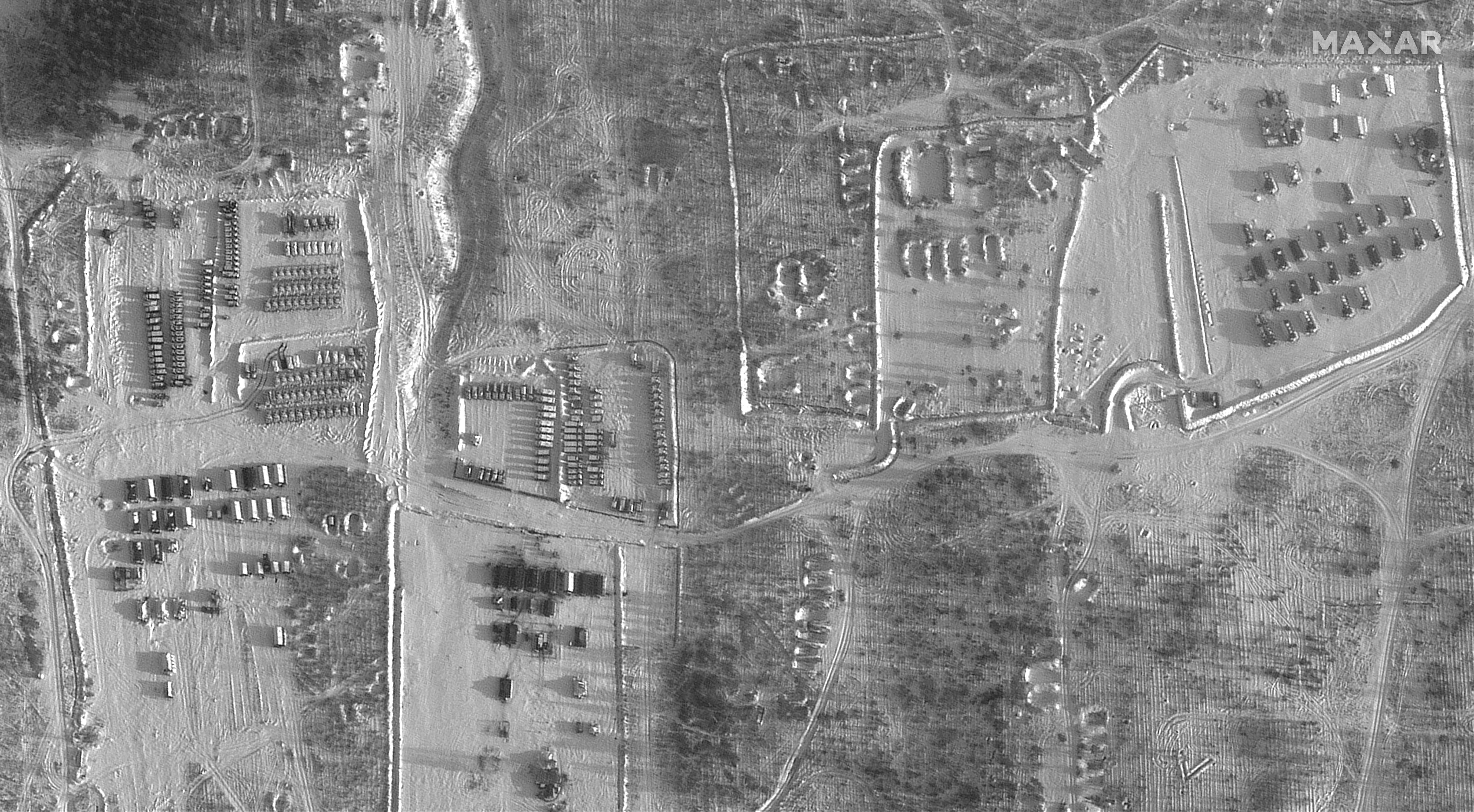 Satellite image shows military equipment deployed to Klimovo Storage Facility, Bryansk Oblast, Russia, Jan. 19, 2022. (Satellite image ©2022 Maxar Technologies)