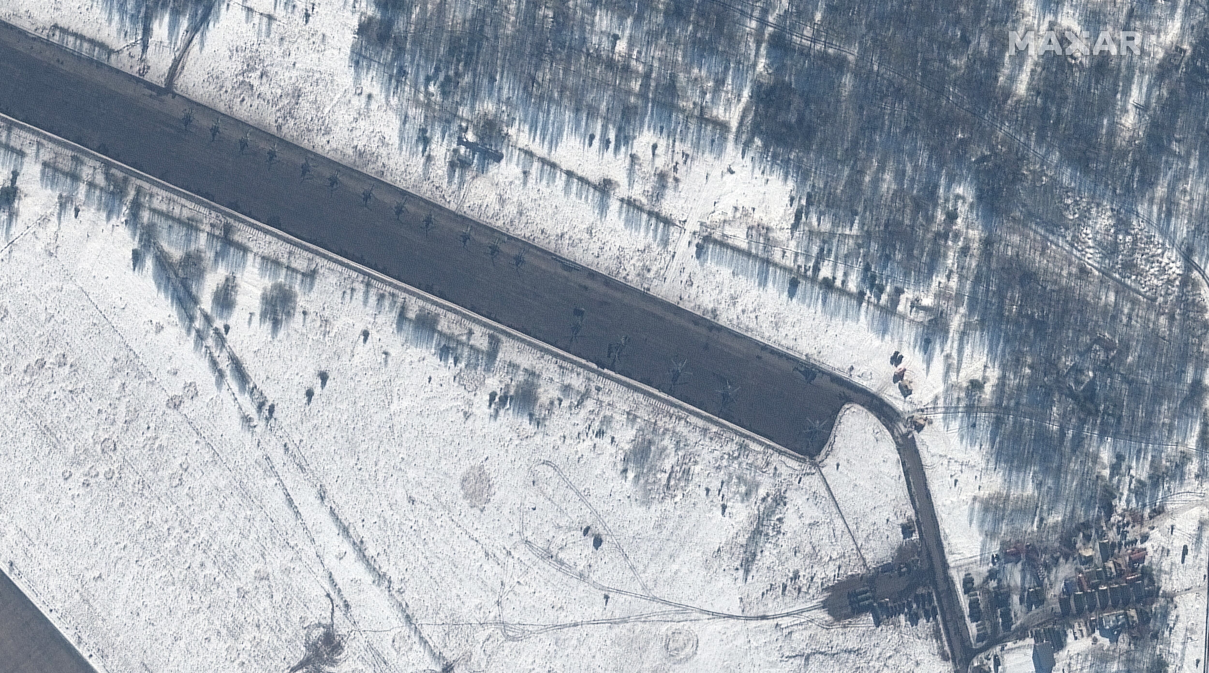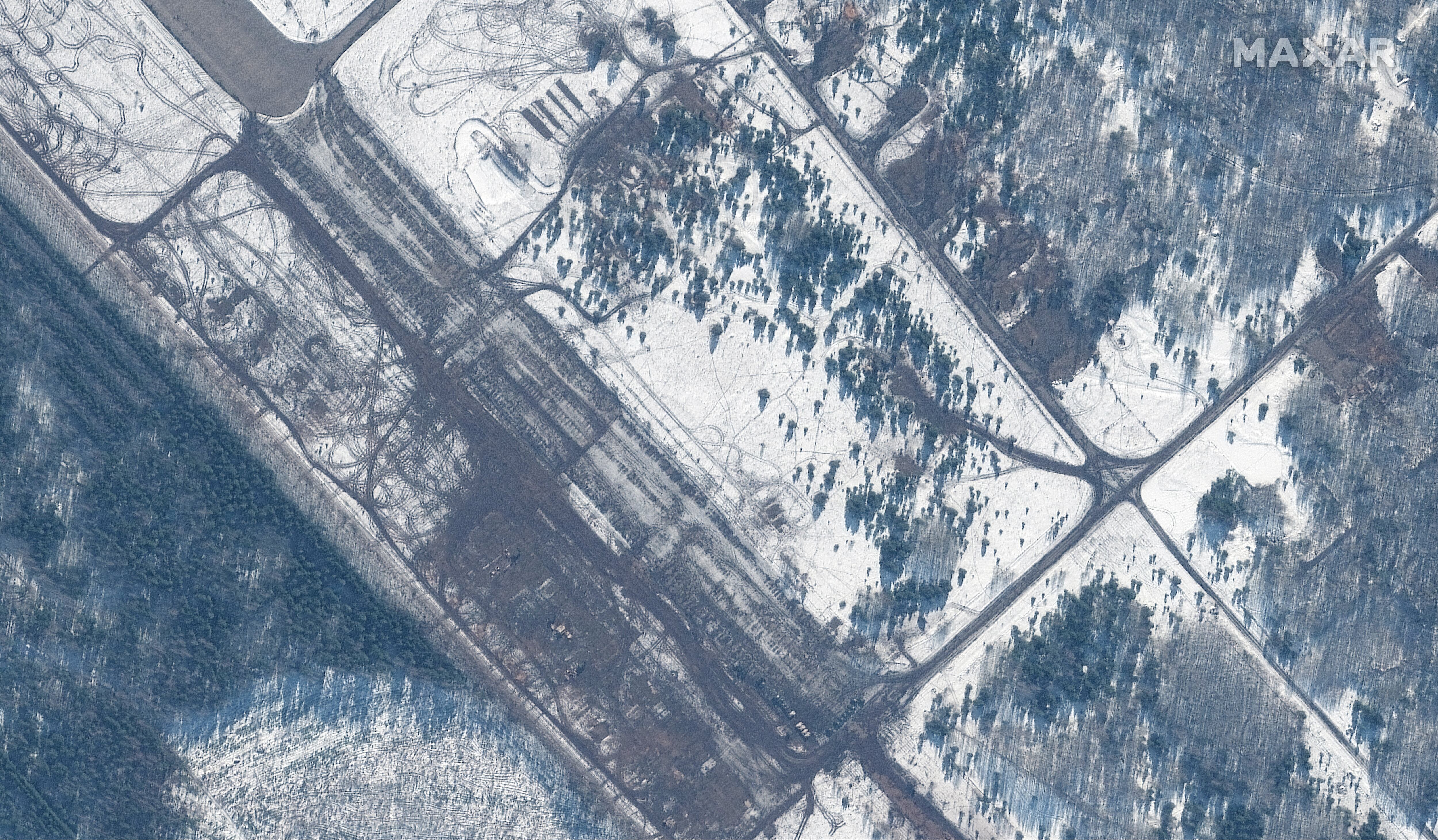 Overview shows troops and equipment departed from Zyabrovka airfield, Belarus, Feb. 15, 2022 (Satellite image ©2022 Maxar Technologies)
