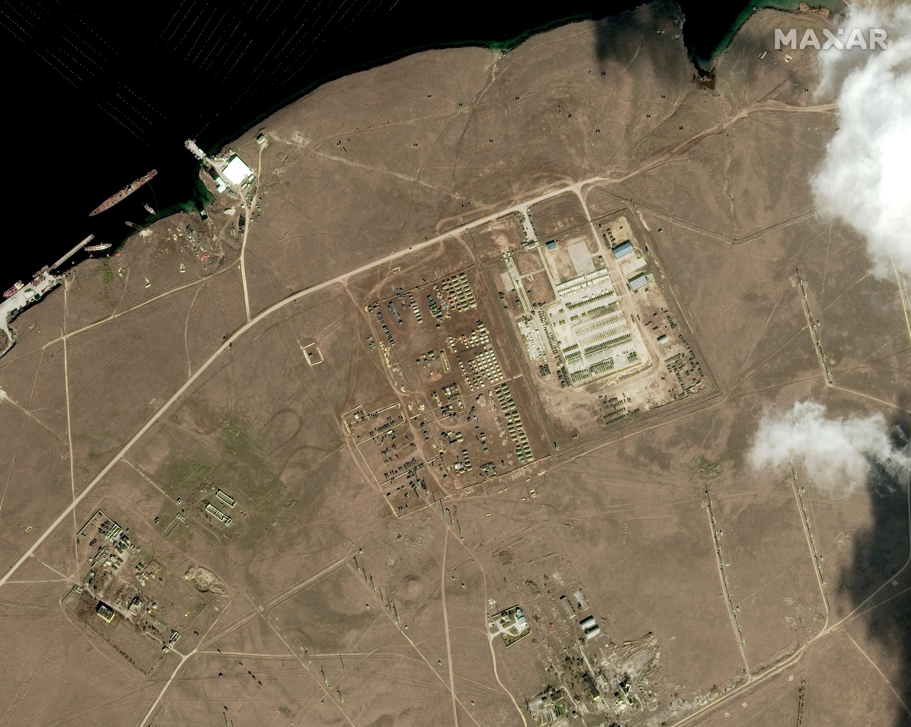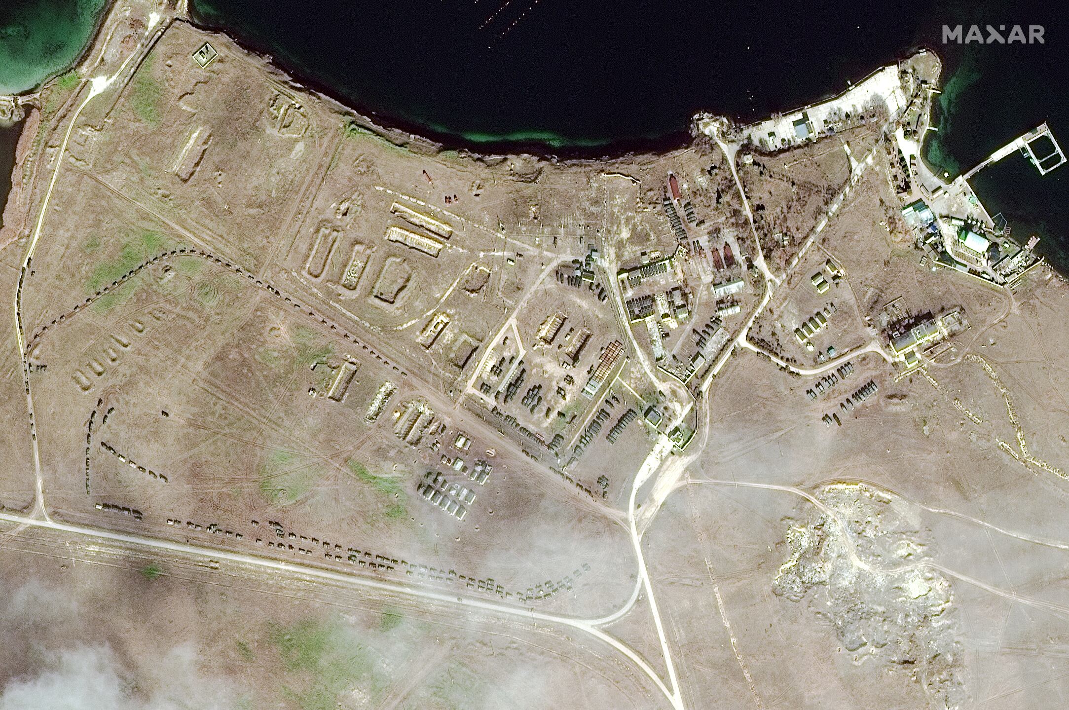 Overview shows equipment and troop tents at Opuk training area, Crimea, Feb. 15, 2022 (Satellite image ©2022 Maxar Technologies)