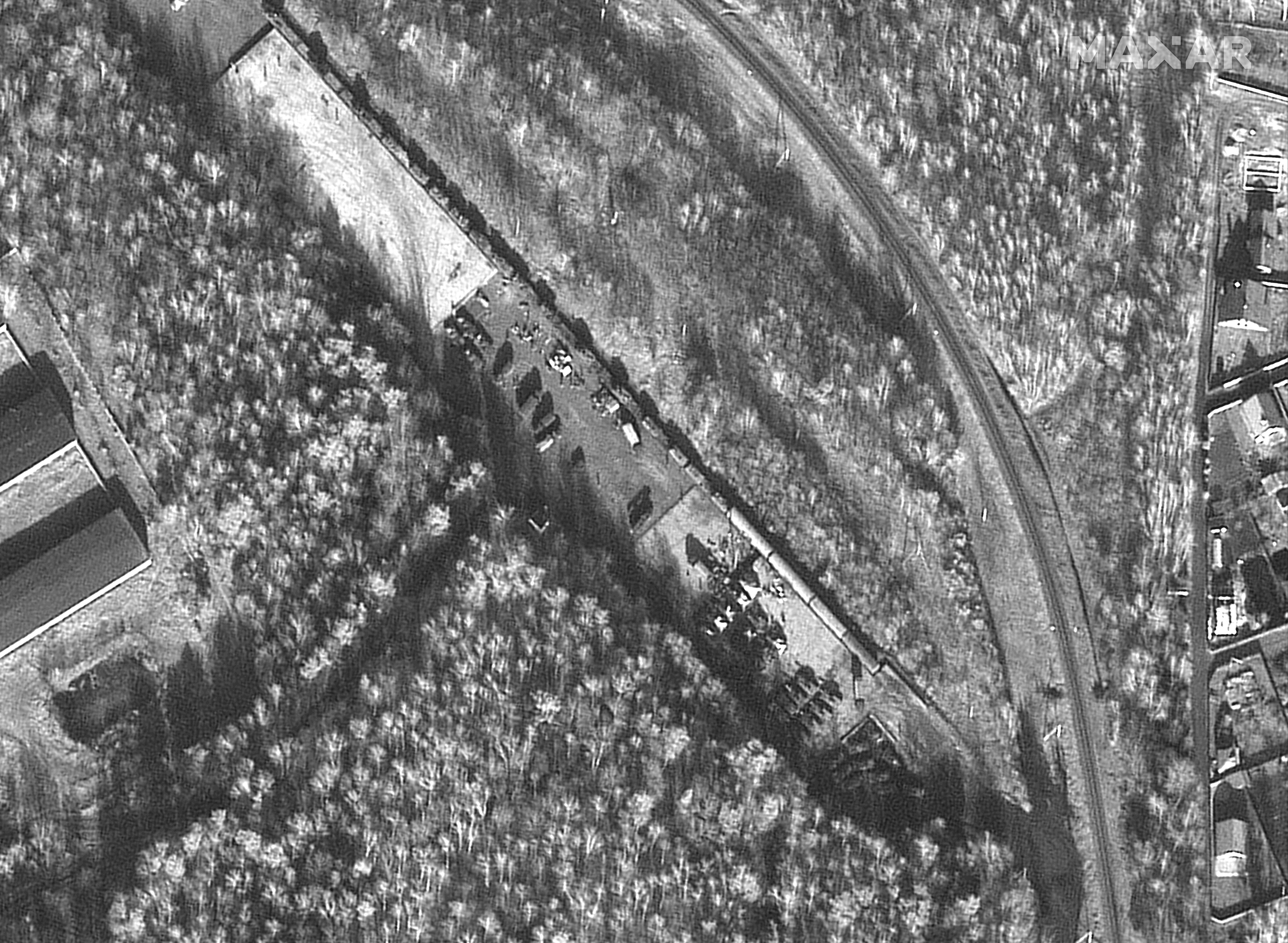 Closer view shows deployed troops and equipment at a railyard near Brestsky training area, Belarus, Feb. 16, 2022 (Satellite image ©2022 Maxar Technologies)