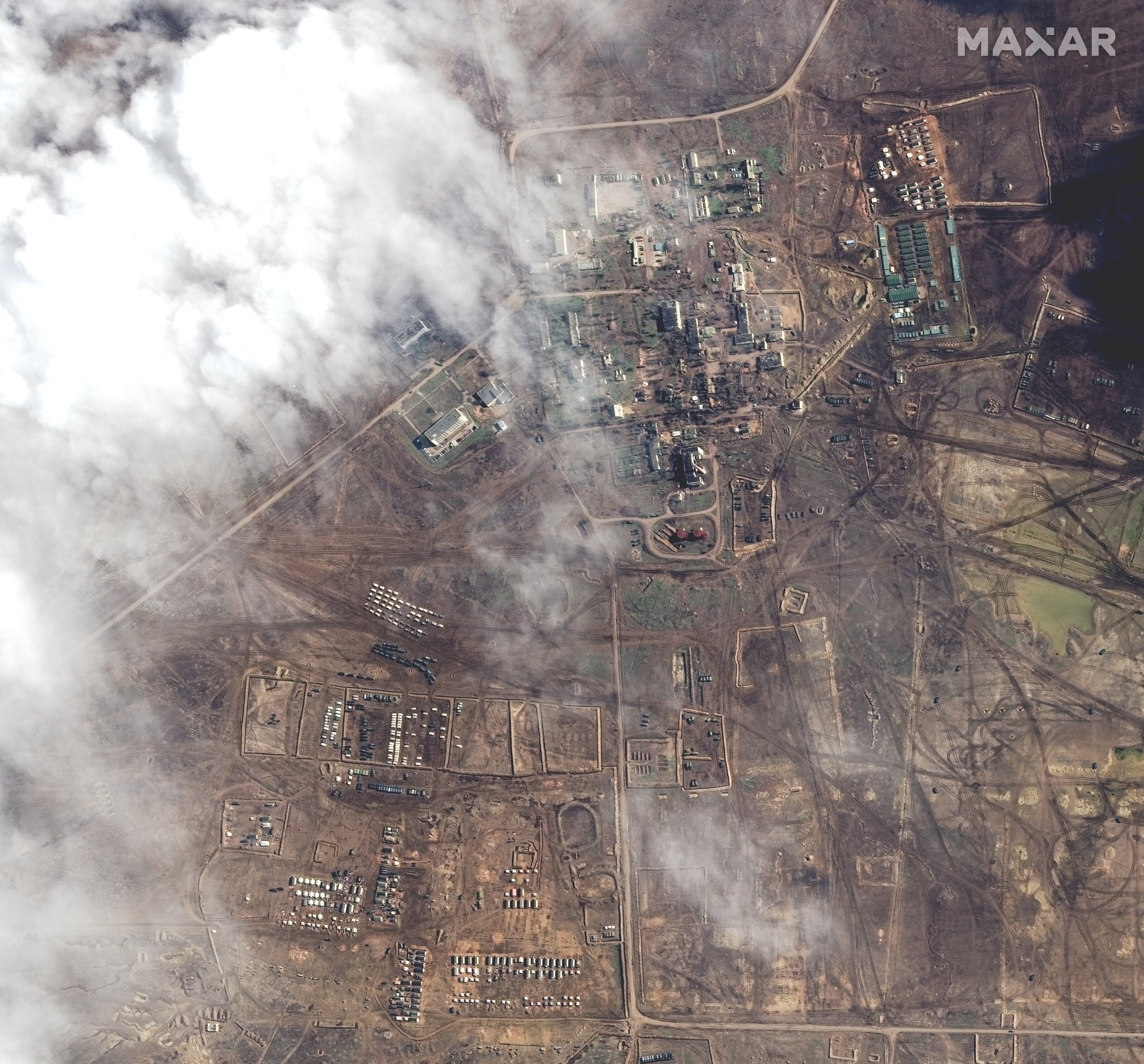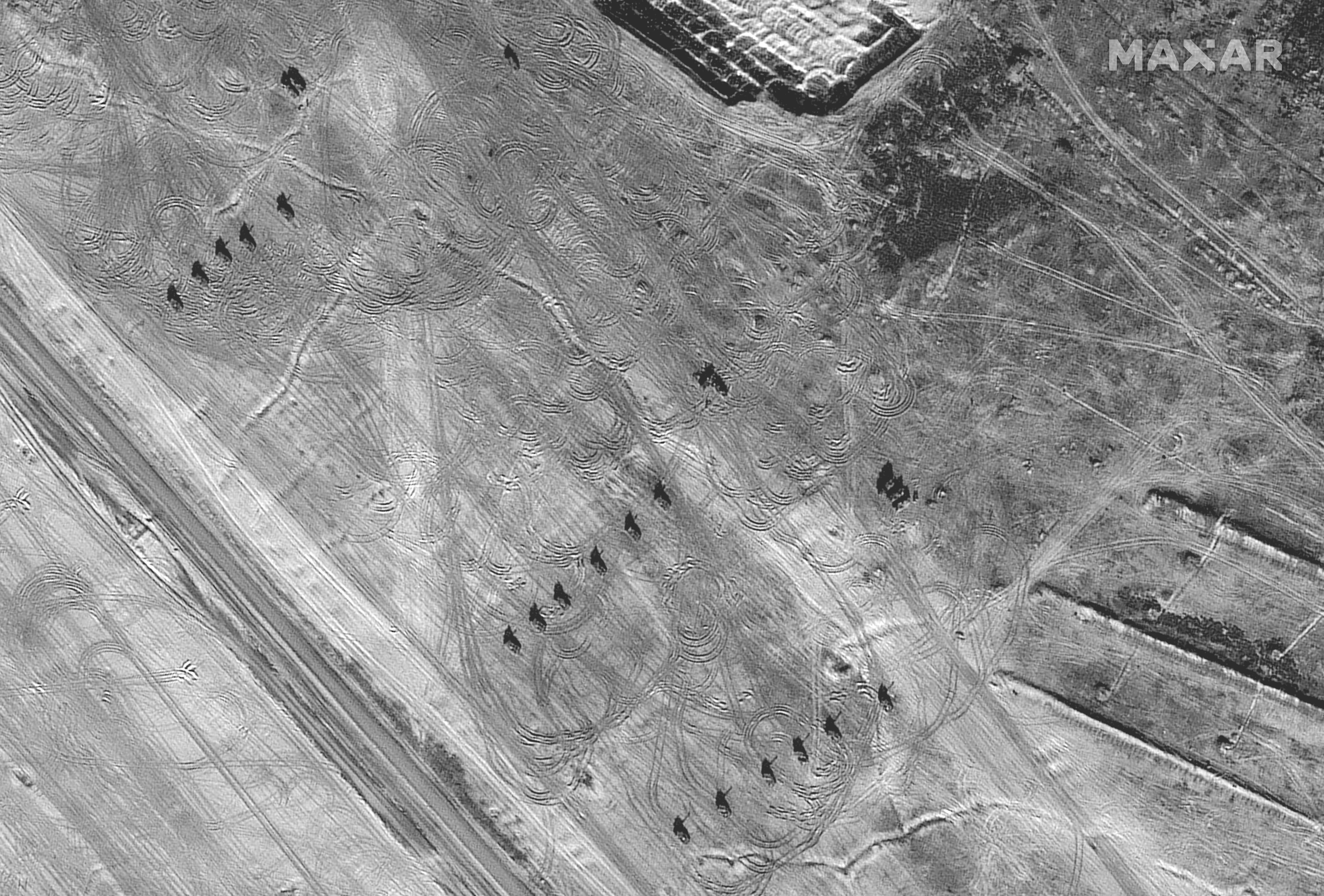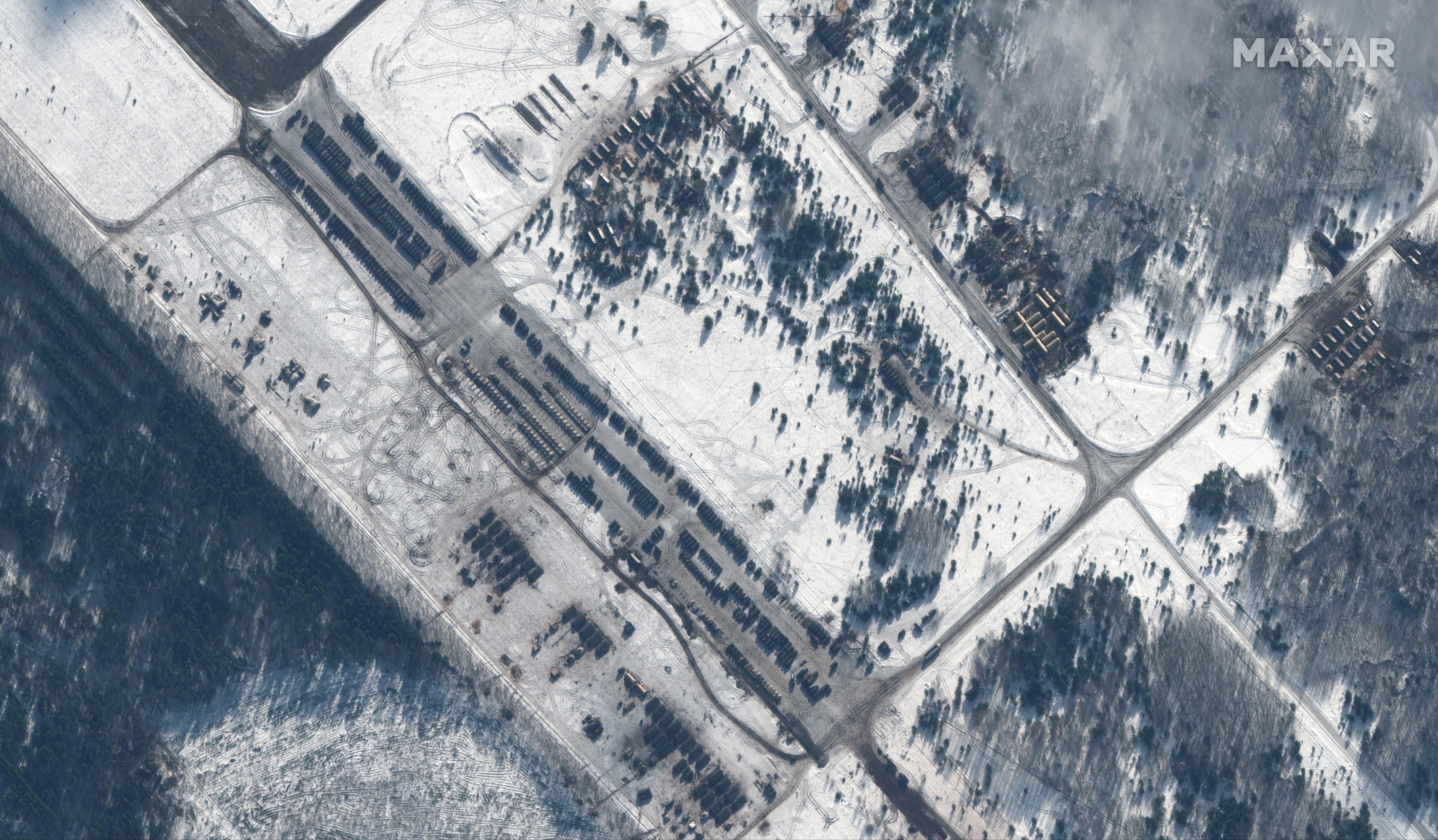 Overview shows troops and equipment at Kursk training area, Russia, Feb. 14, 2022 (Satellite image ©2022 Maxar Technologies)