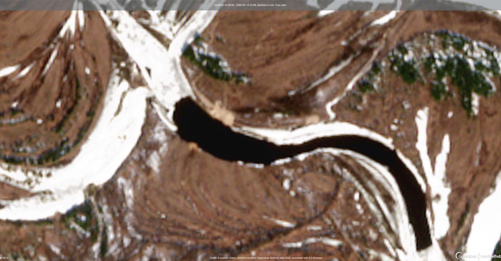 Overview shows Pripyat River, Belarus, before the pontoon bridge on Feb. 14, 2022 (Satellite image ©2022 Maxar Technologies)