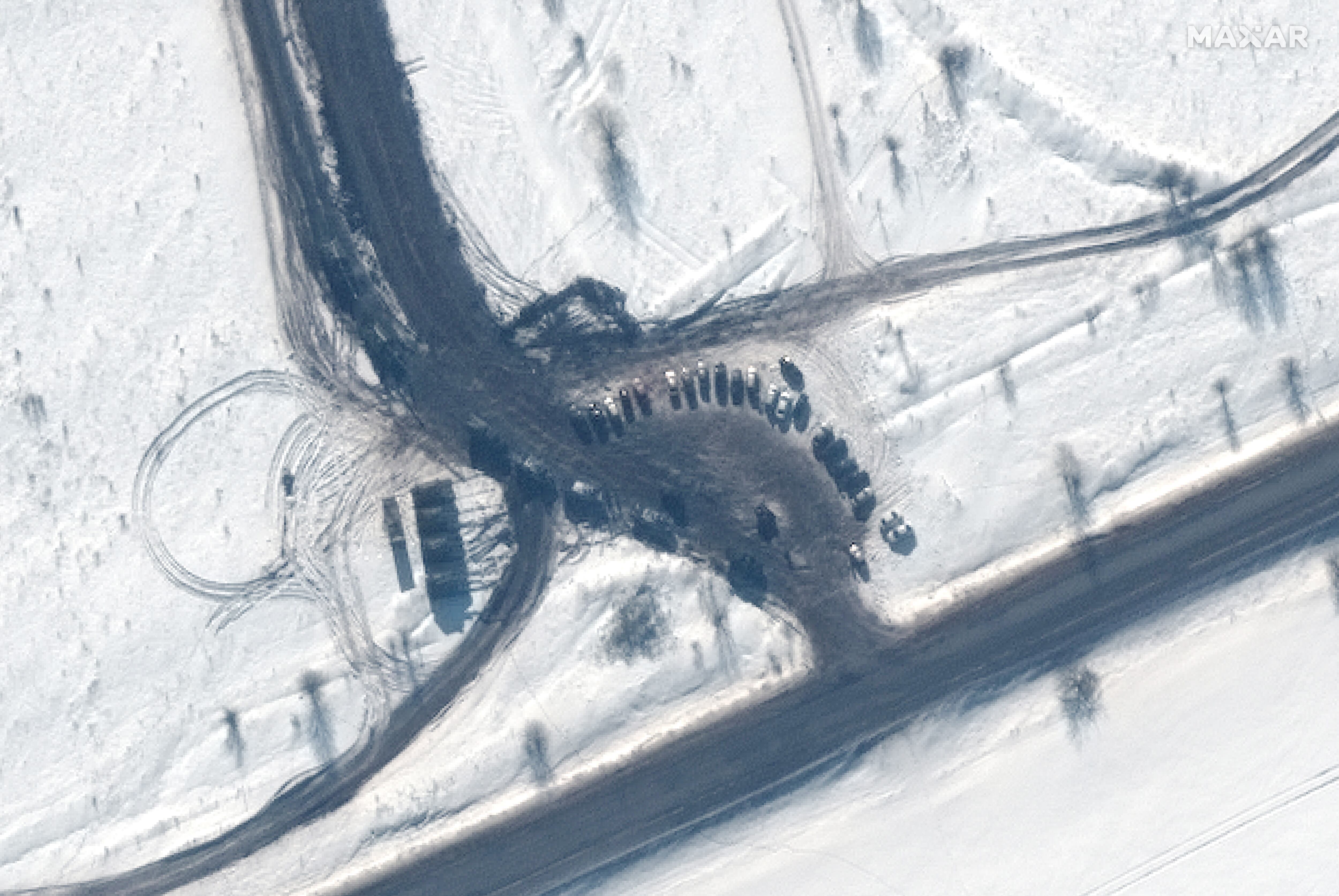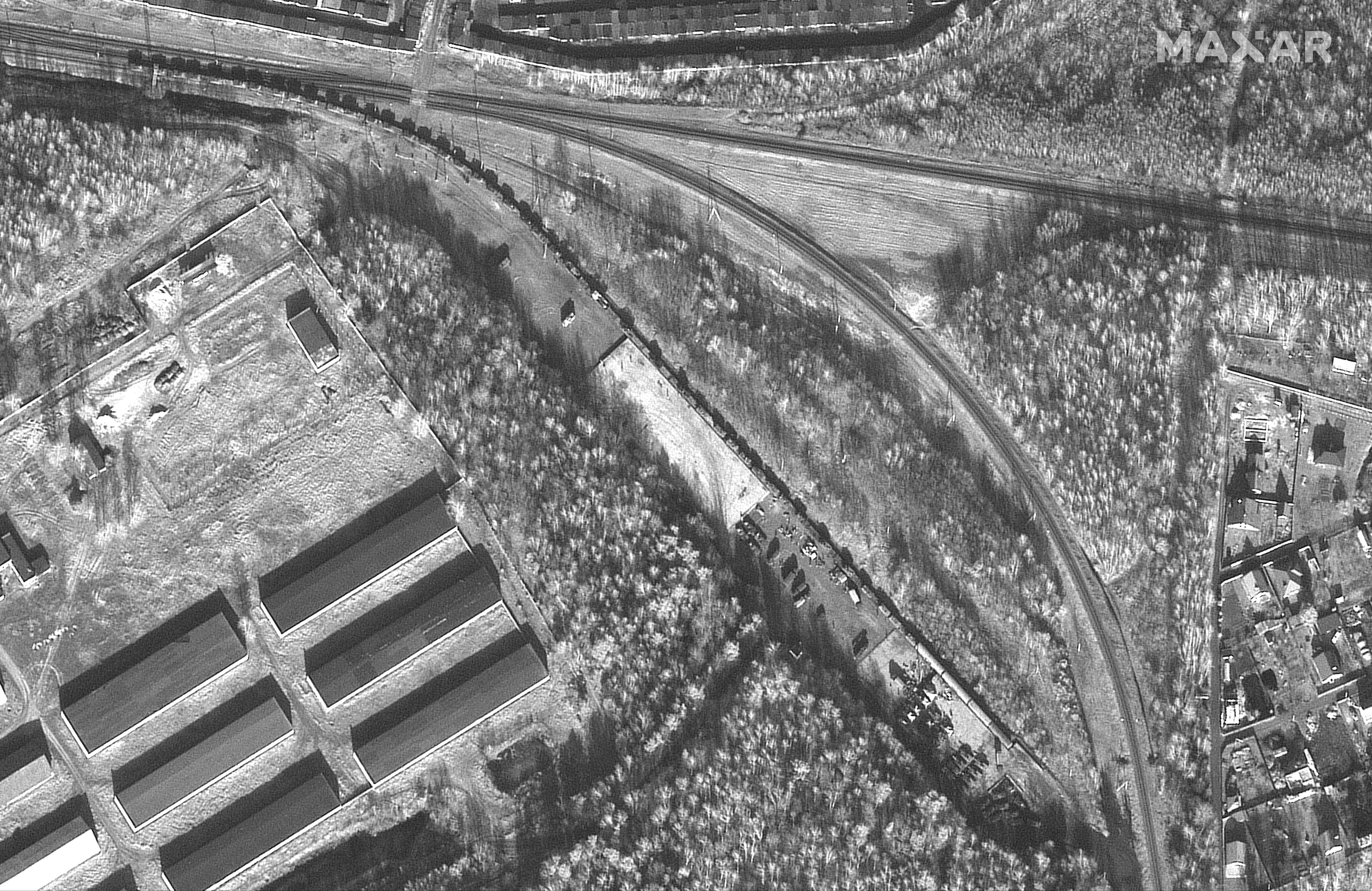 Overview shows armor and self-propelled artillery in a convoy near the entrance of Kursk training area, Russia, Feb. 14, 2022 (Satellite image ©2022 Maxar Technologies)