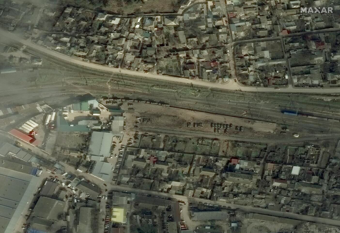 Overview shows armored vehicles at a railyard near Yevpatoria, Crimea, Feb. 15, 2022 (Satellite image ©2022 Maxar Technologies)