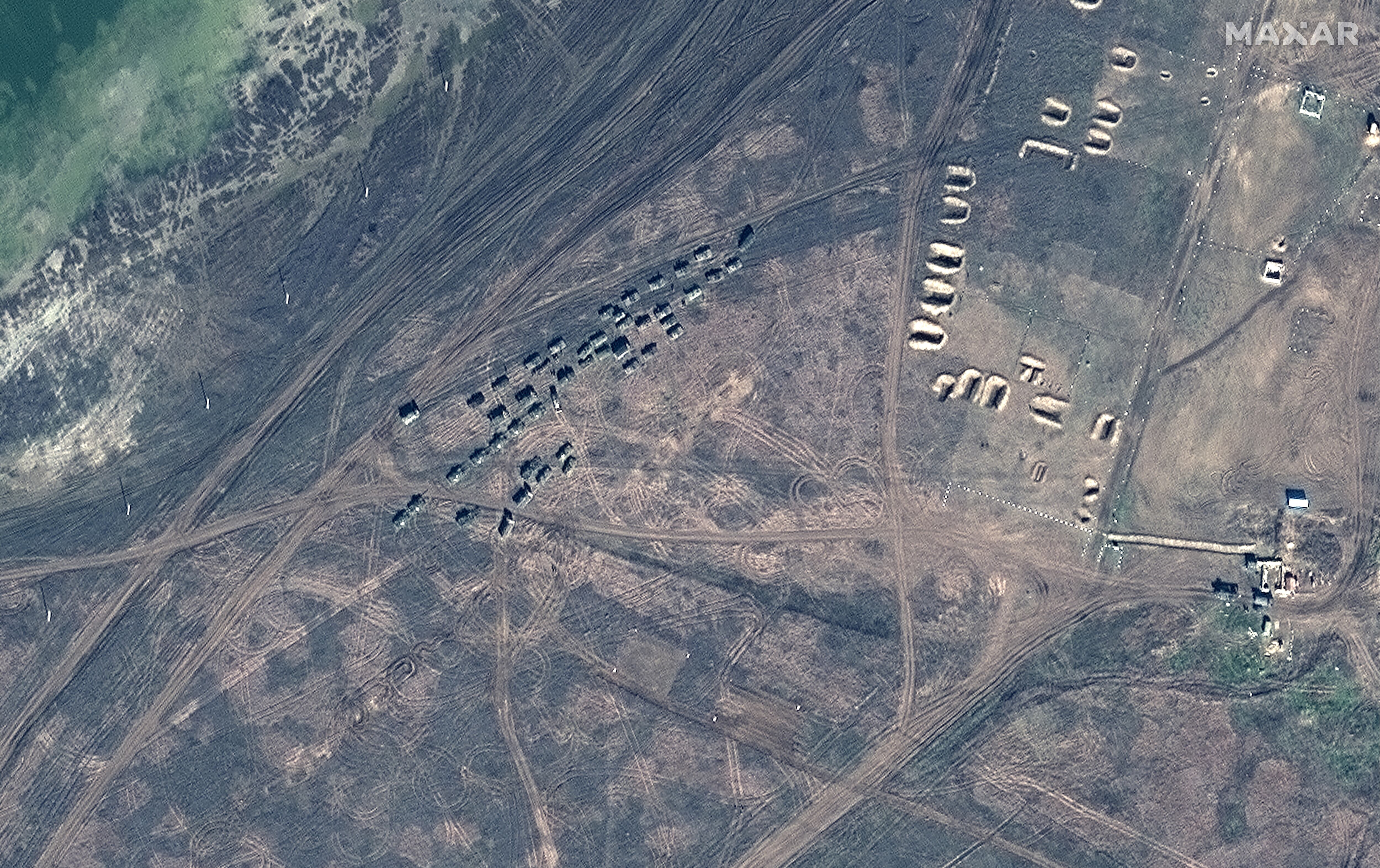 Overview shows military equipment positioned in a convoy at Lake Donuzlav, Crimea, Feb. 15, 2022 (Satellite image ©2022 Maxar Technologies)