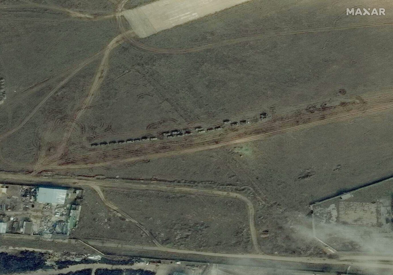 Overview shows military convoy near a garrison in Yevpatoria, Crimea, Feb. 15, 2022 (Satellite image ©2022 Maxar Technologies)