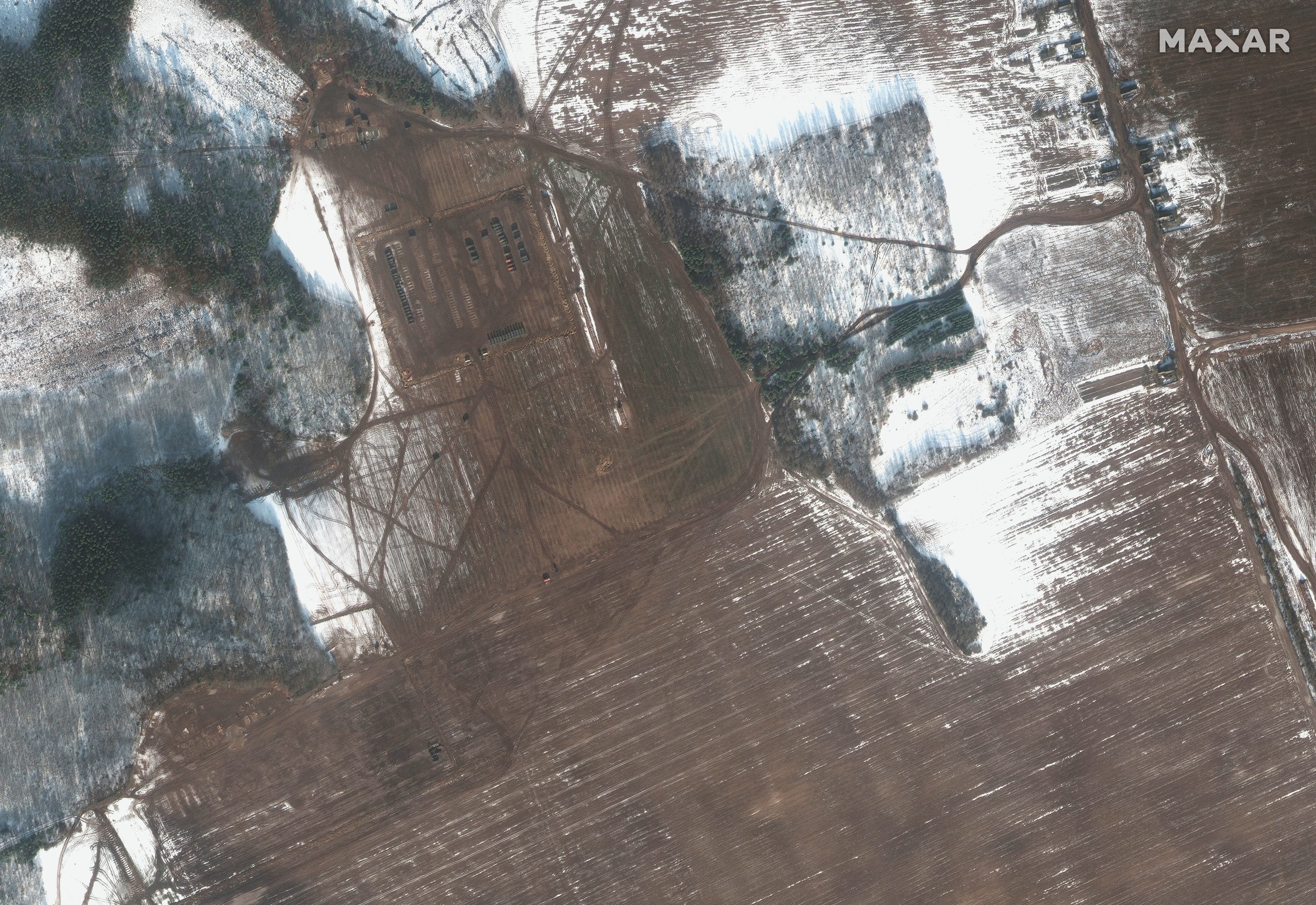 Overview shows troops and equipment at Brestsky training area, Belarus, Feb. 16, 2022 (Satellite image ©2022 Maxar Technologies)
