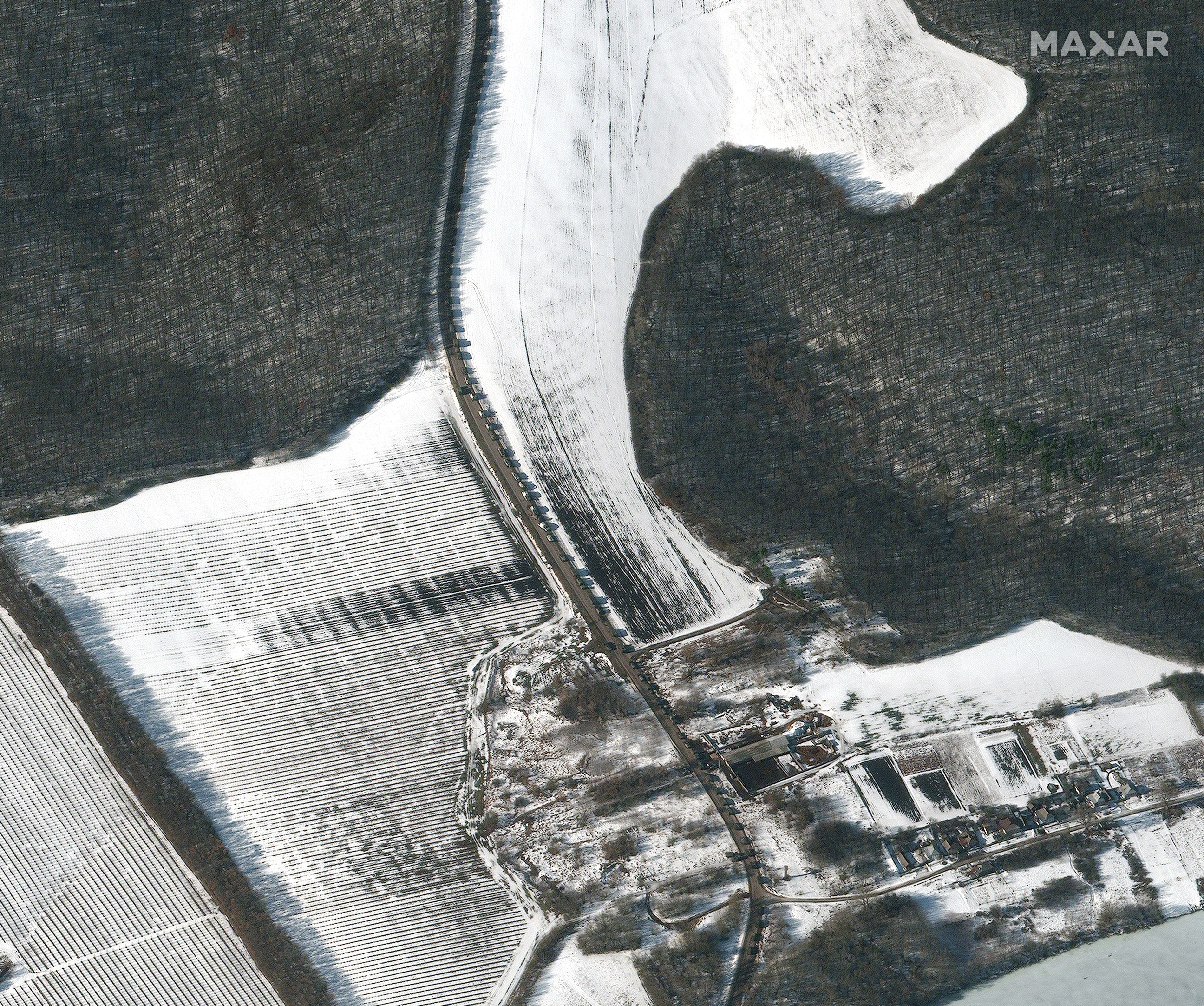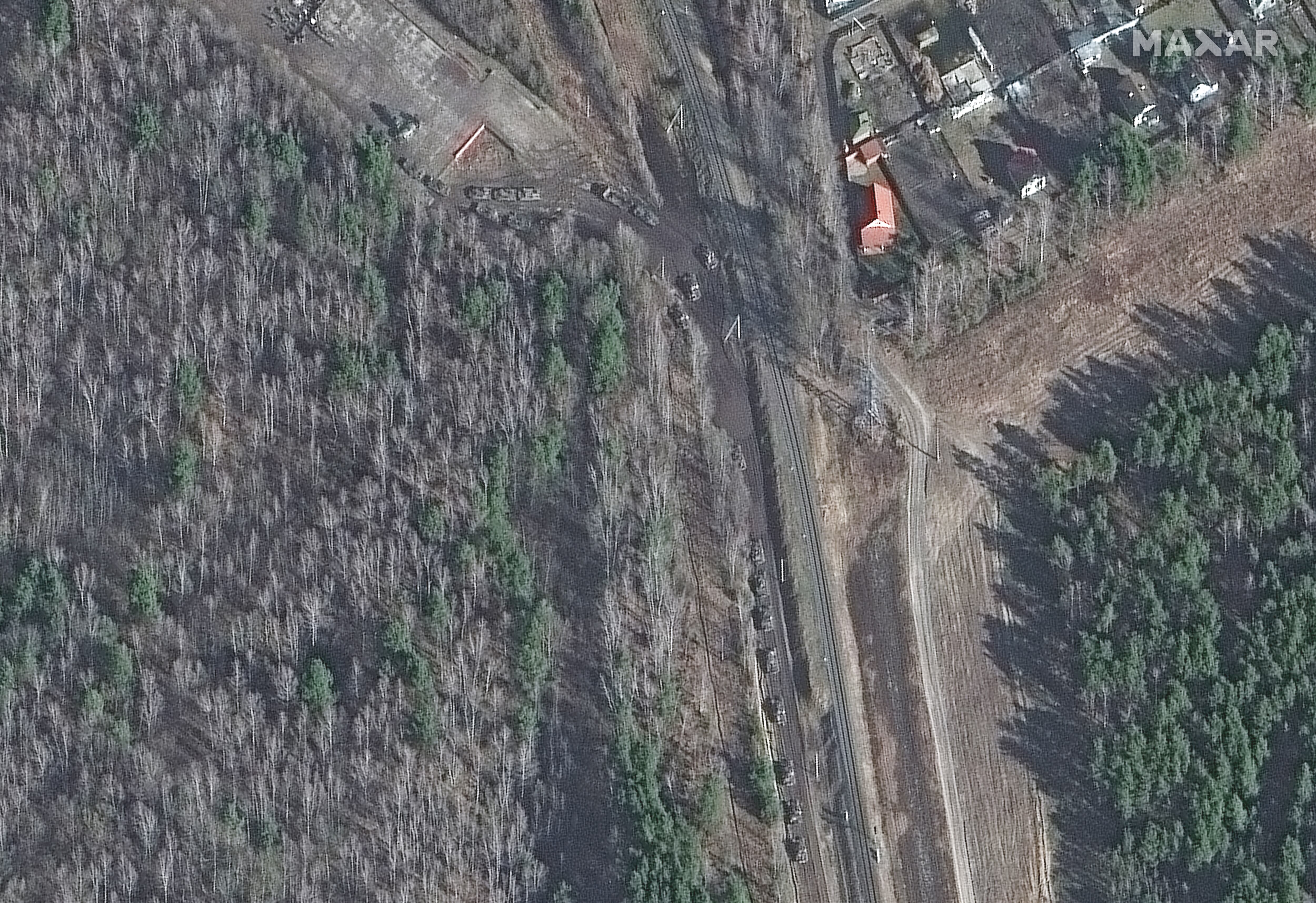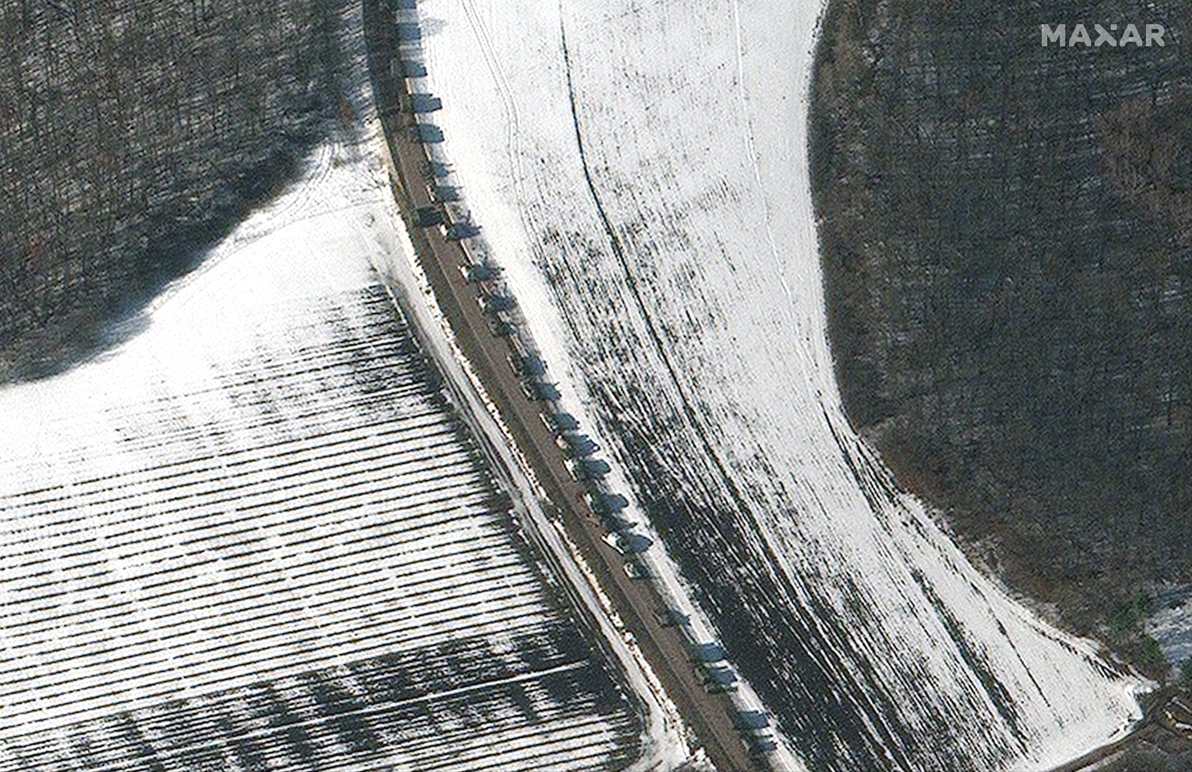 Overview shows part of a long military convoy heading west near Sergievka, Russia, Feb. 24, 2022 (Satellite image ©2022 Maxar Technologies)