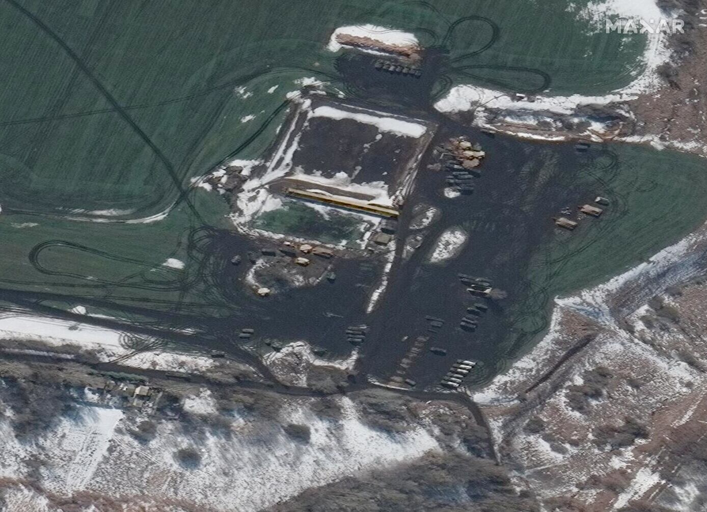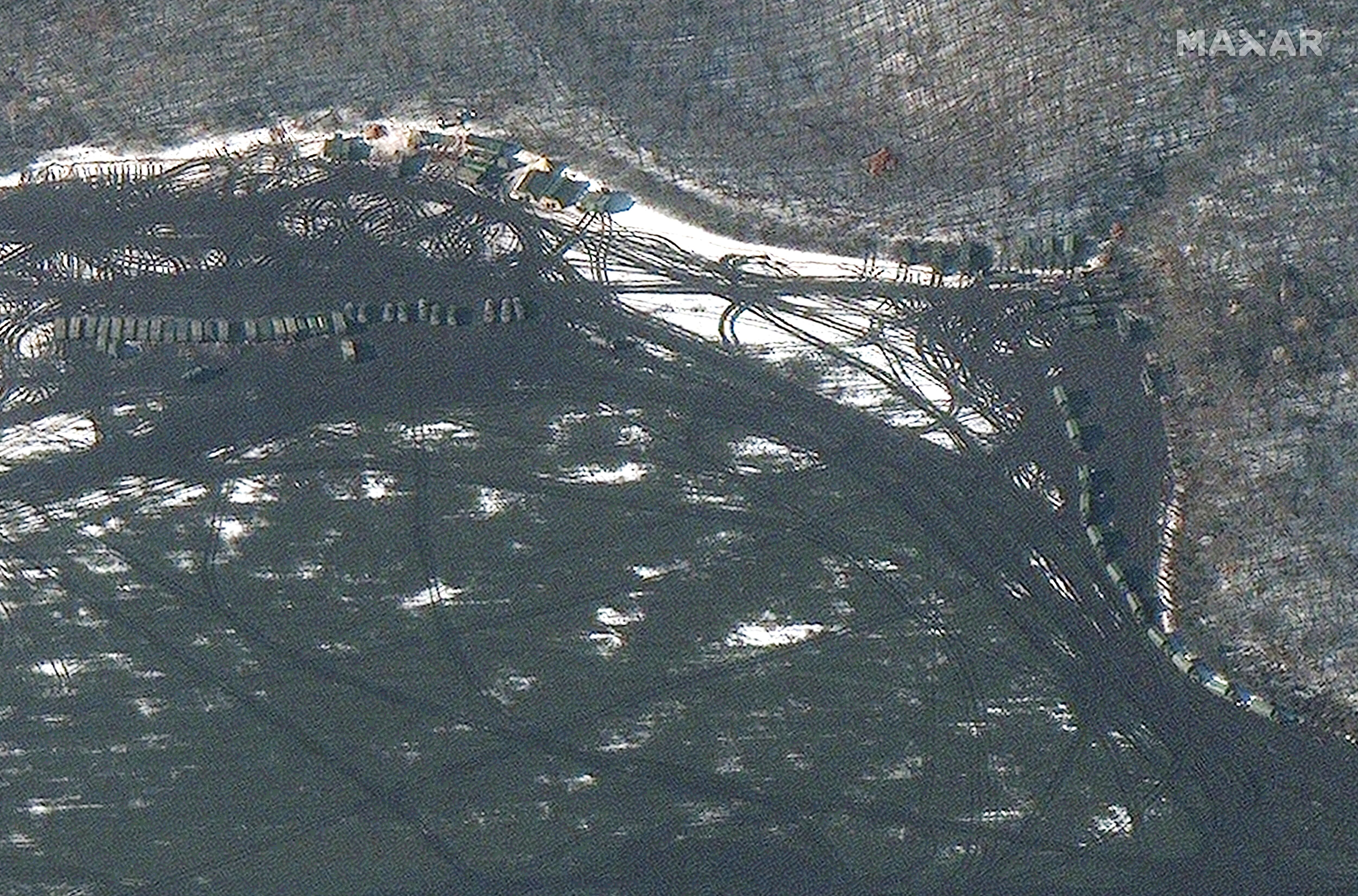 Overview shows ground forces deployed near Krasnaya Yaruga, Russia, Feb. 24, 2022 (Satellite image ©2022 Maxar Technologies)