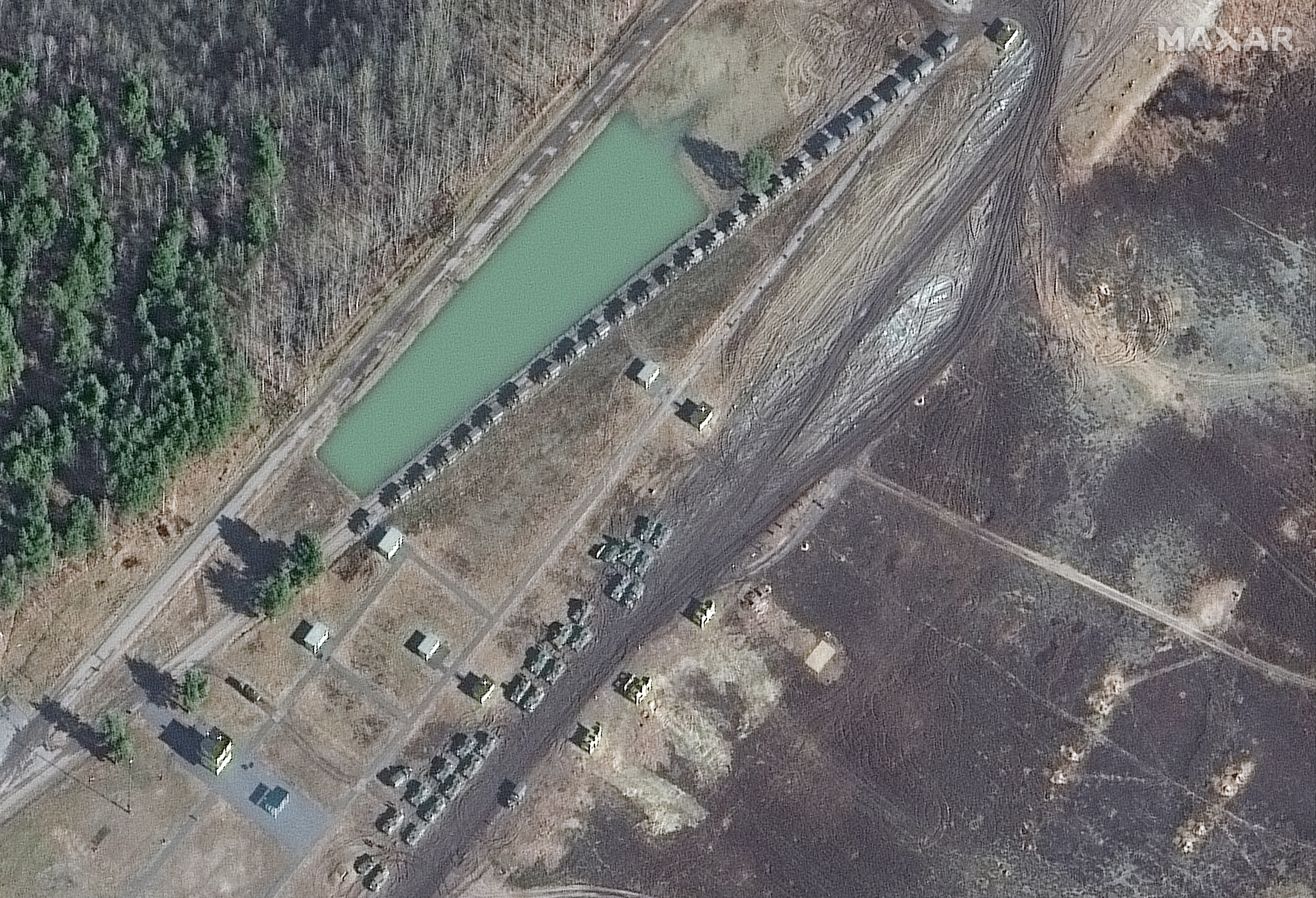 Overview shows armor and artillery in a convoy position at Brestsky training area, Brest, Belarus, Feb. 24, 2022 (Satellite image ©2022 Maxar Technologies)