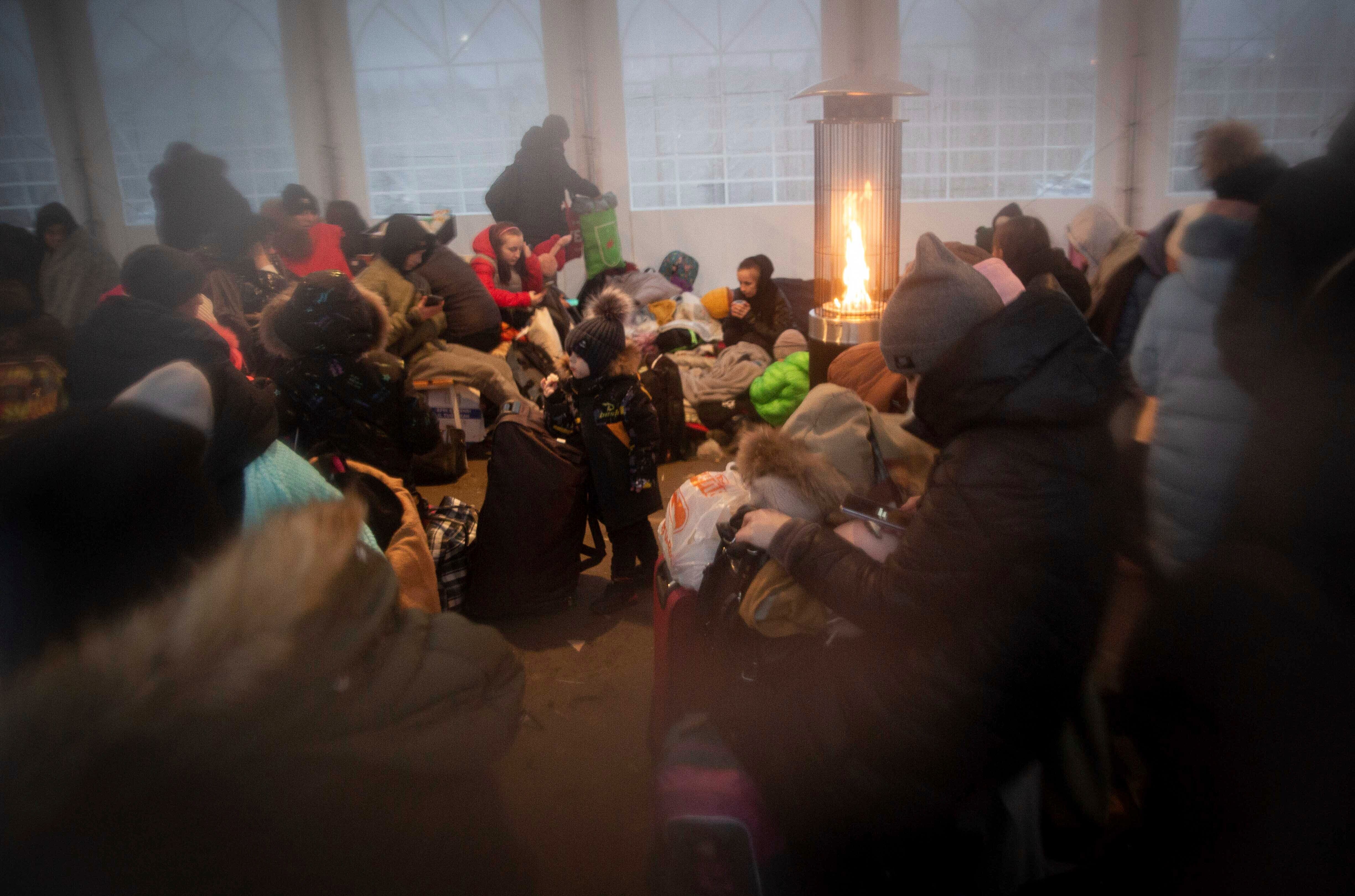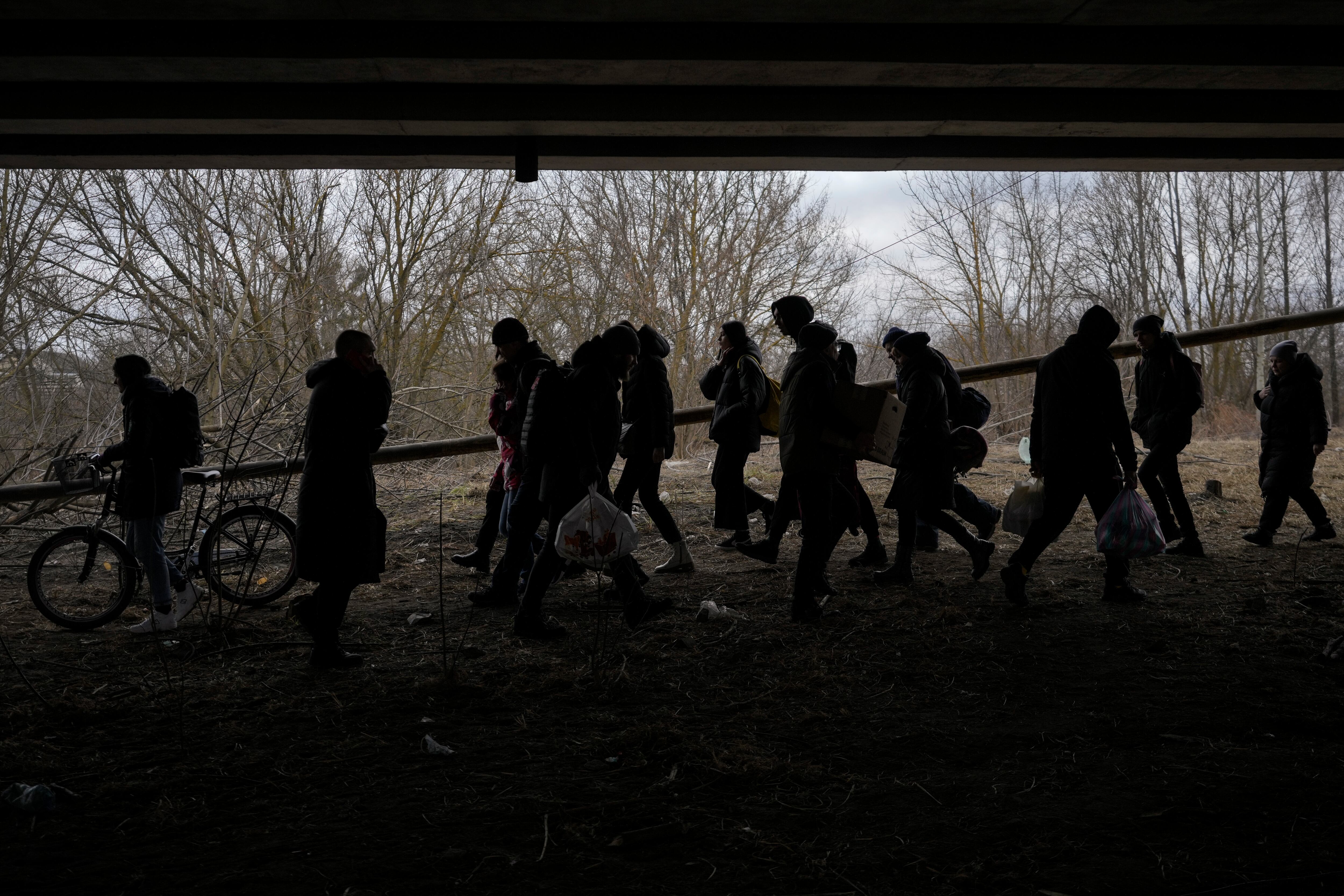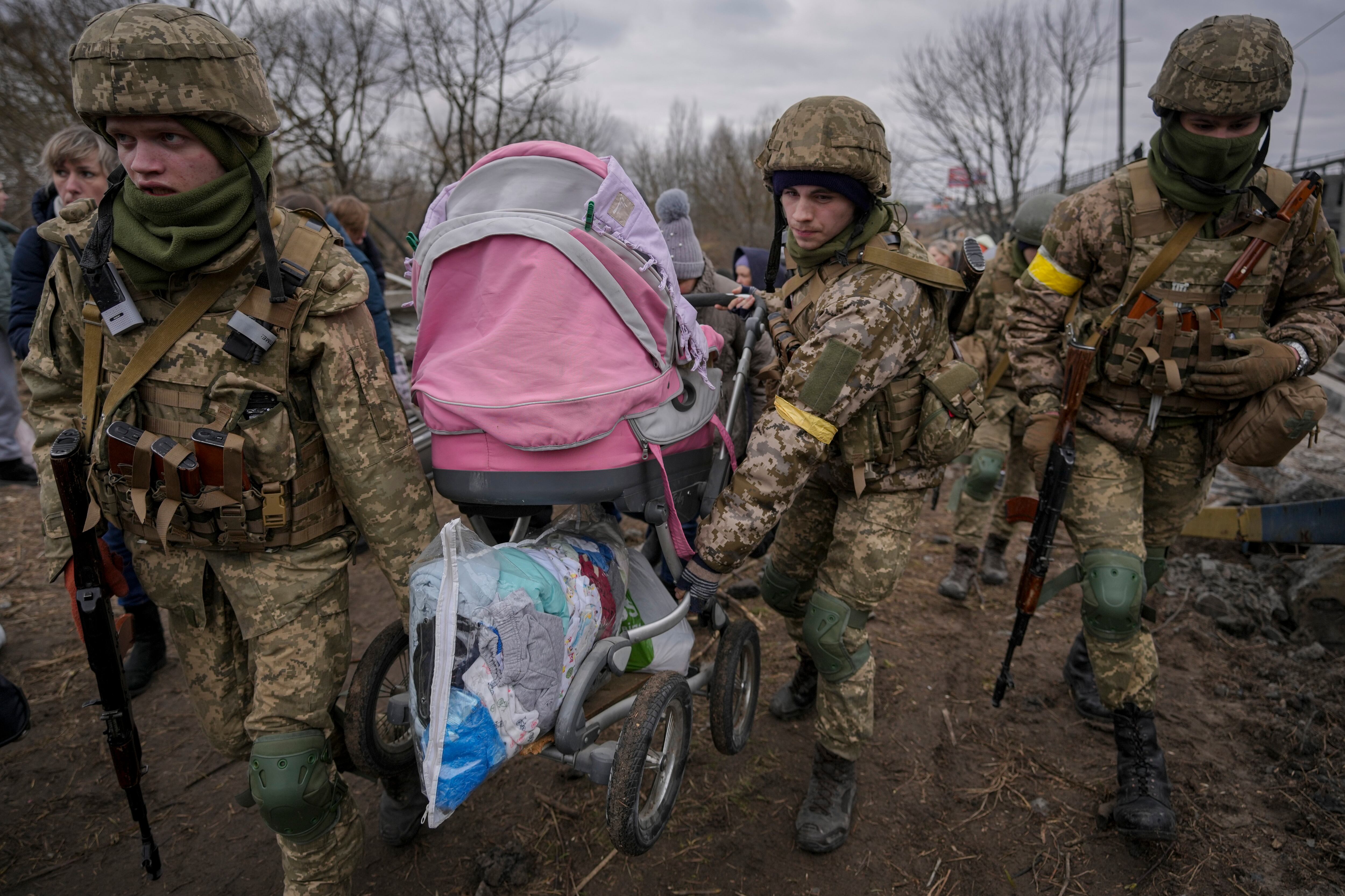 A factory and a store burn after being bombarded in Irpin, on the outskirts of Kyiv, Ukraine, Sunday, March 6, 2022. (Emilio Morenatti/AP)A factory and a store are burning after been bombarded in Irpin, in the outskirts of Kyiv, Ukraine, Sunday, March 6, 2022. (Emilio Morenatti/AP)Ukrainian servicemen help an elderly woman, in the town of Irpin, Ukraine, Sunday, March 6, 2022. (Andriy Dubchak/AP)Ukrainian servicemen carry a baby stroller after crossing the Irpin River on an improvised path under a bridge that was destroyed by a Russian airstrike, while assisting people fleeing the town of Irpin, Ukraine, Saturday, March 5, 2022. (Vadim Ghirda/AP)A Ukrainian serviceman holds a baby crossing the Irpin river on an improvised path under a bridge that was destroyed by a Russian airstrike, while assisting people fleeing the town of Irpin, Ukraine, Saturday, March 5, 2022. (Vadim Ghirda/AP)People cross on an improvised path under a bridge that was destroyed by a Russian airstrike, while fleeing the town of Irpin, Ukraine, Saturday, March 5, 2022. (Vadim Ghirda/AP)A woman holds a dog while crossing the Irpin River on an improvised path under a bridge that was destroyed by a Russian airstrike, while assisting people fleeing the town of Irpin, Ukraine, Saturday, March 5, 2022. (Vadim Ghirda/AP)People cross on an improvised path under a bridge that was destroyed by a Russian airstrike, while fleeing the town of Irpin, Ukraine, Saturday, March 5, 2022. (Vadim Ghirda/AP)Ukrainian civilians receive weapons training inside a cinema in Lviv, western Ukraine, Saturday, March 5, 2022. (Felipe Dana/AP)Ukrainian soldiers drive on an armored military vehicle in the outskirts of Kyiv, Ukraine, Saturday, March 5, 2022. (AP Photo/Emilio Morenatti)Ukrainian paramedics cover a grave with their country's flag of their colleague Valentyna Pushych, who was killed by Russian troops in a cemetery in Kyiv, Ukraine, Saturday, March 5, 2022. (Efrem Lukatsky/AP)Glass on a hospital window is shattered by shelling in Mariupol, Ukraine, Thursday, March 3, 2022. (Evgeniy Maloletka/AP)The children of medical workers warm themselves in a blanket as they wait for their relatives in a hospital in Mariupol, Ukraine, Friday, March 4, 2022. (Evgeniy Maloletka/AP)A woman traveling with others fleeing Ukraine, looks out of the window of a bus near the border crossing in Korczowa, Poland, Saturday, March 5, 2022. (Visar Kryeziu/AP)Refugees, mostly women with children, rest inside a tent after arriving at the border crossing, in Medyka, Poland on Sunday, March 6, 2022. (Visar Kryeziu/AP)Refugees, mostly women with children, rest inside a tent after arriving at the border crossing, in Medyka, Poland on Sunday, March 6, 2022. (Visar Kryeziu/AP)