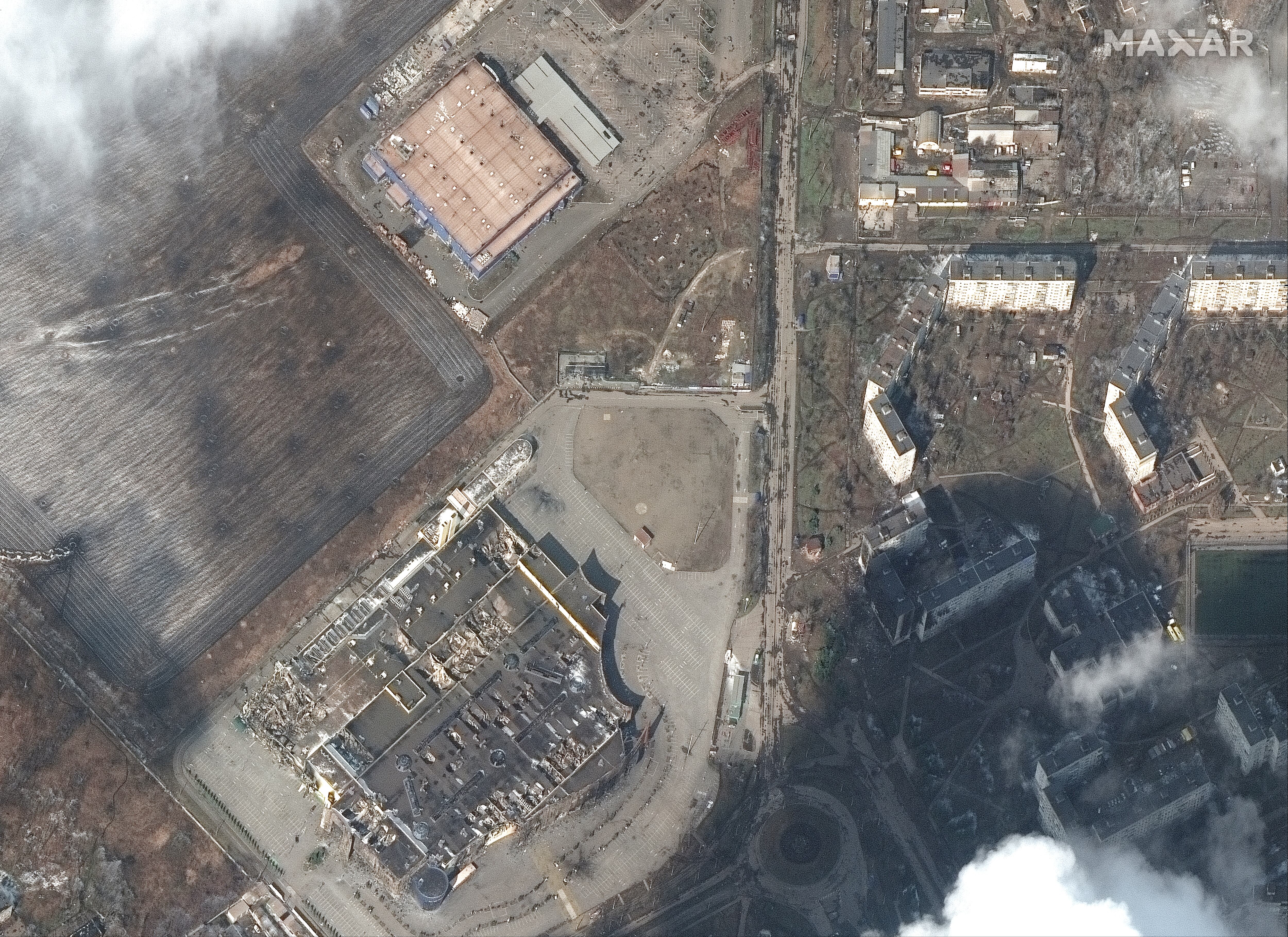 Overview shows destroyed grocery stores and shopping malls in Mariupol, Ukraine, March 9, 2022 (Satellite image ©2022 Maxar Technologies)