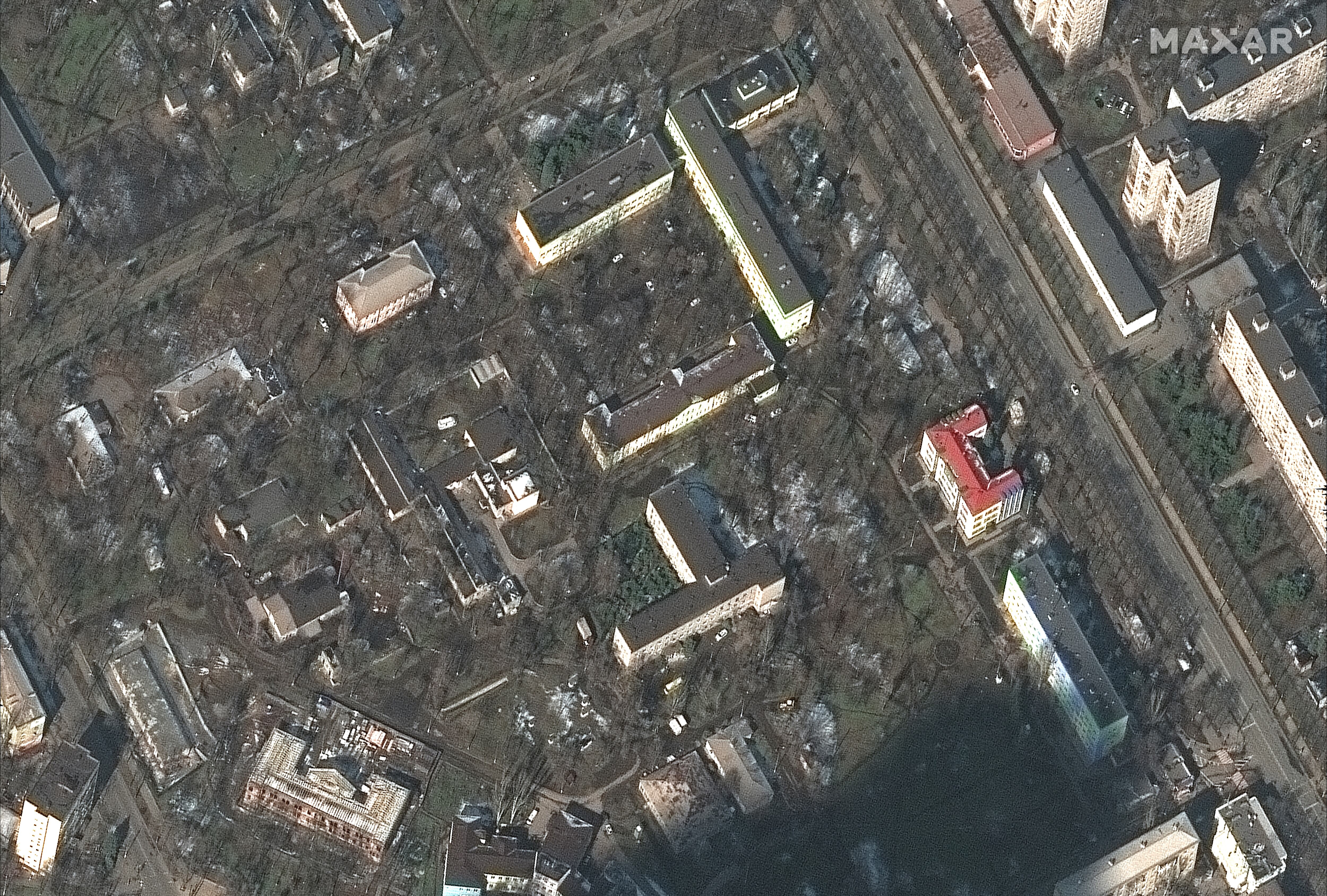 Overview shows Mariupol Hospital in Mariupol, Ukraine, March 9, 2022 (Satellite image ©2022 Maxar Technologies)
