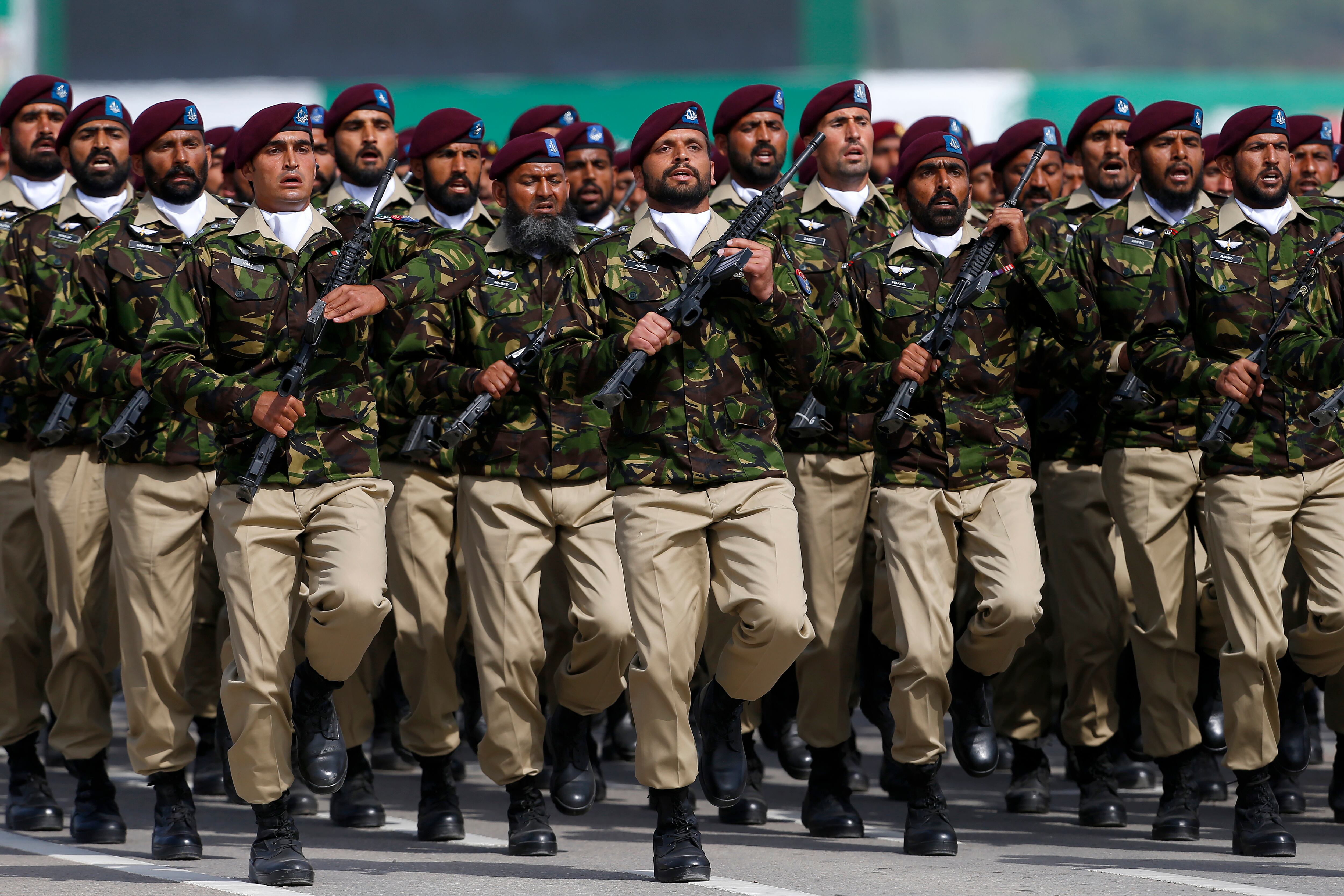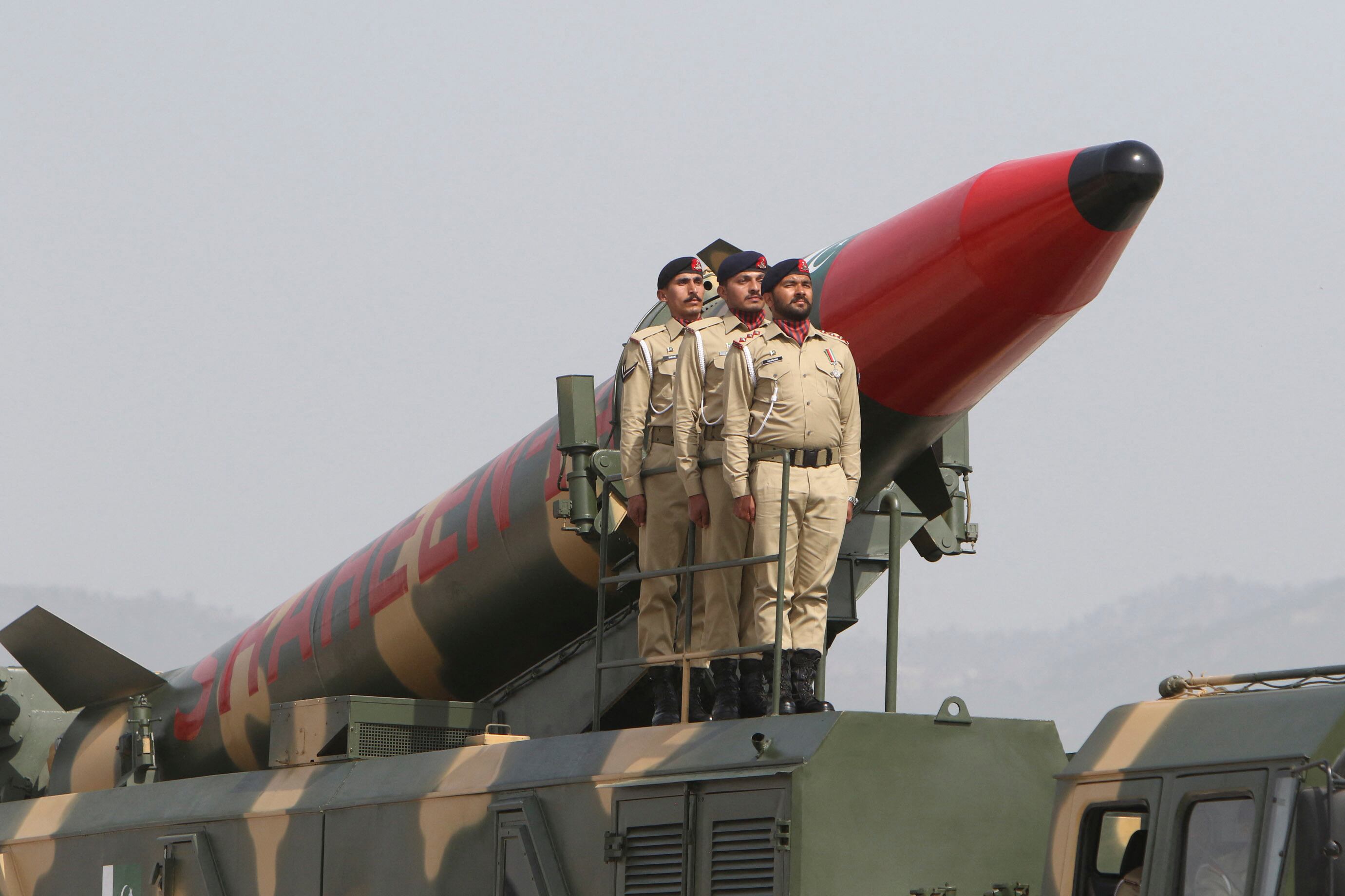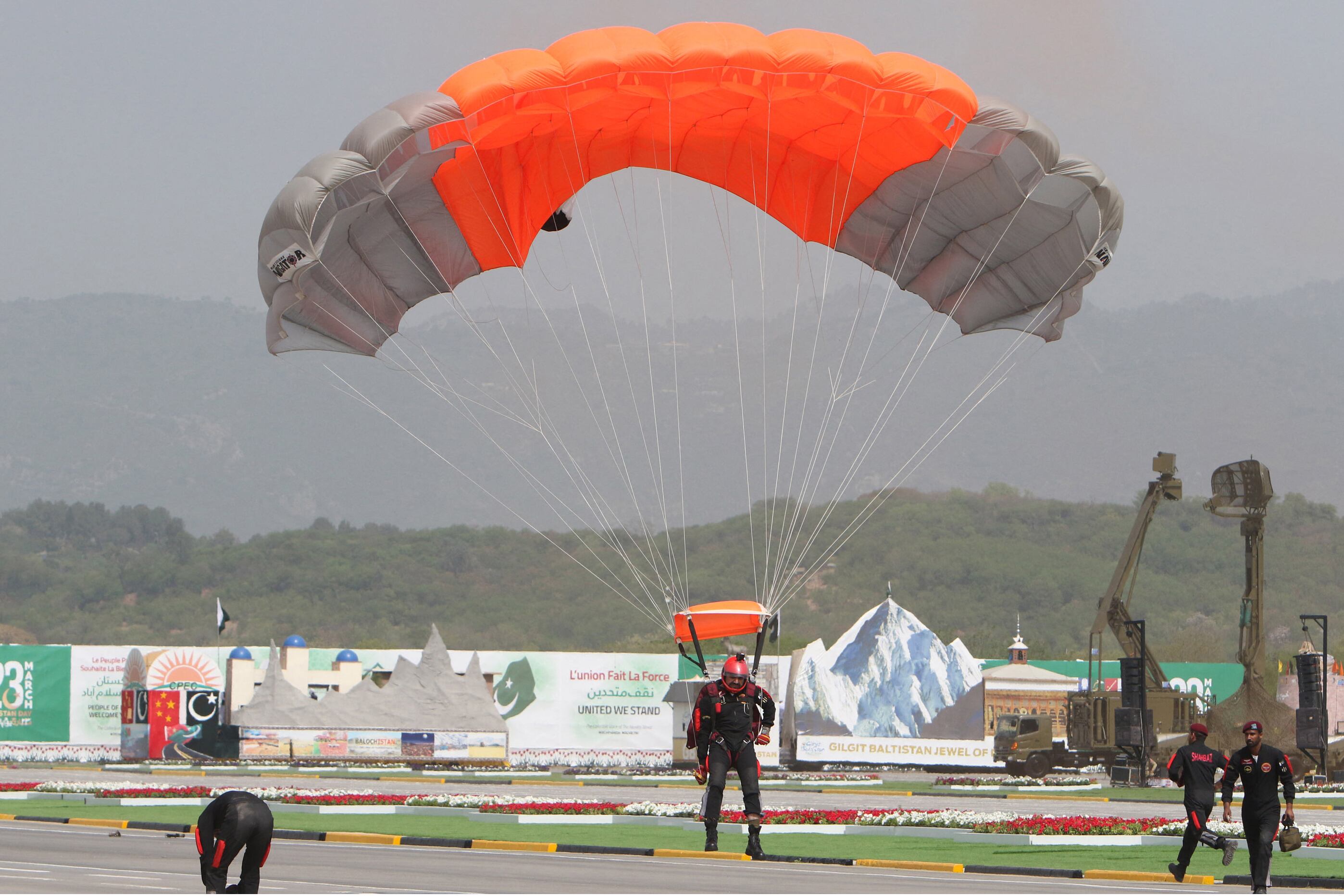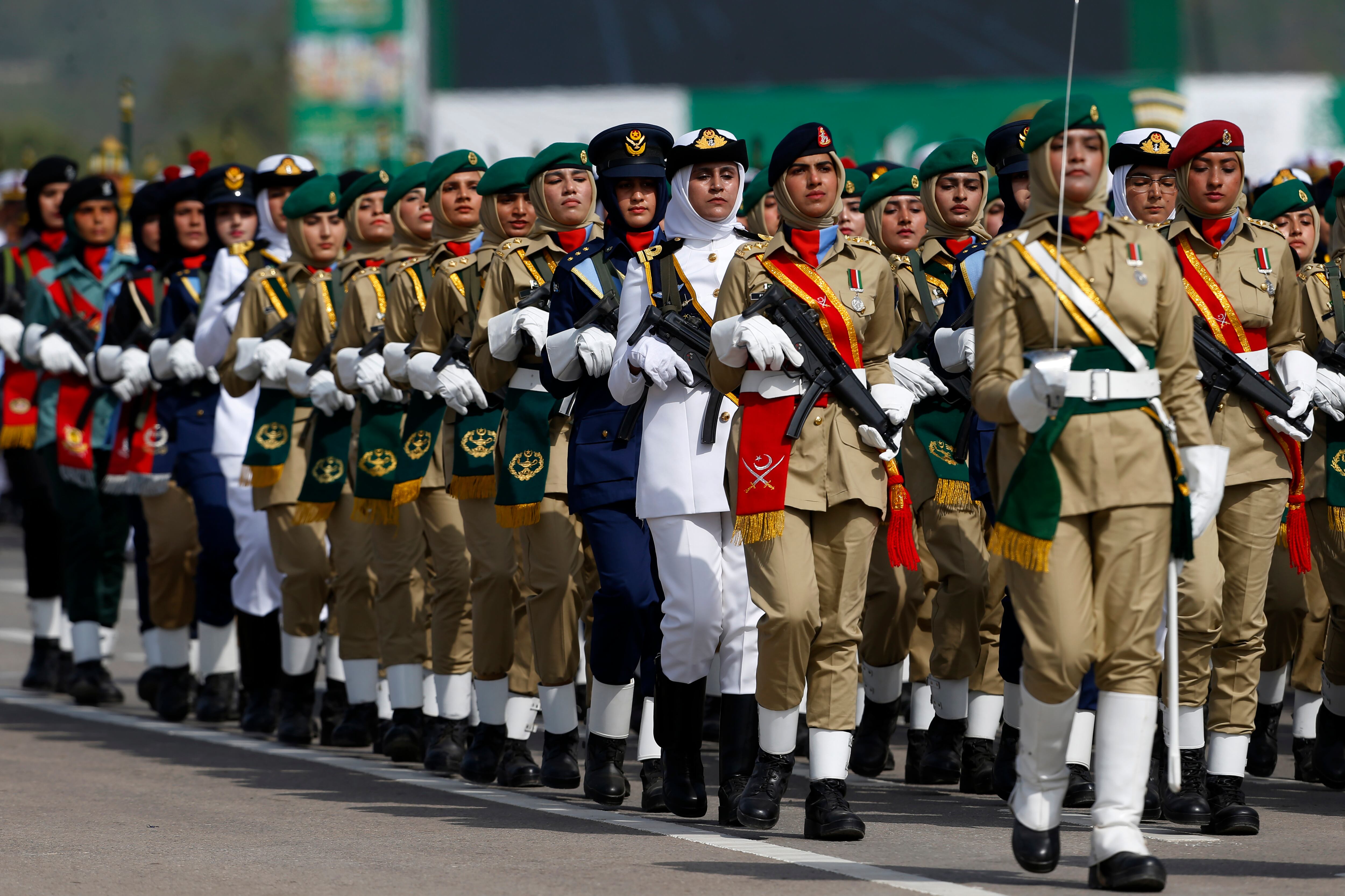 Pakistani soldiers stand on a vehicle carrying the Shaheen long-range ballistic missile during a parade in Islamabad on March 23, 2022. (Ghulam Rasool/AFP via Getty Images)Pakistani soldiers stand atop a tank during the March 23, 2022, parade. (Ghulam Rasool/AFP via Getty Images)A military vehicle carries the the Shahpar-2 drone during the parade in Islamabad on March 23, 2022. (Ghulam Rasool/AFP via Getty Images)Soldiers stand on a vehicle carrying Ra'ad cruise missiles. (Ghulam Rasool/AFP via Getty Images)Pakistani soldiers stand on armored vehicles during the parade in Islamabad on March 23, 2022. (Ghulam Rasool/AFP via Getty Images)Soldiers salute from atop military vehicles carrying missiles Nasr, right, and Babur, left, during the parade. (Ghulam Rasool/AFP via Getty Images)A Pakistani soldier stands atop a military vehicle carrying Fatah missiles. (Ghulam Rasool/AFP via Getty Images)Pakistan Air Force jets fly in formation during a parade in Islamabad on March 23, 2022. (Farooq Naeem/AFP via Getty Images)Pakistan Air Force jets perform aerobatic maneuvers during the parade. (Ghulam Rasool/AFP via Getty Images)Pakistani soldiers hang from a rope of a helicopter flying in Islamabad on March 23, 2022. (Ghulam Rasool/AFP via Getty Images)A paratrooper lands after performing during the Pakistan Day parade in Islamabad on March 23, 2022. (Ghulam Rasool/AFP via Getty Images)Pakistan Navy helicopters fly during the parade on March 23, 2022. (Ghulam Rasool/AFP via Getty Images)Soldiers stand on tanks during the parade in Islamabad on March 23, 2022. (Ghulam Rasool/AFP via Getty Images)Pakistani-made Shaheen-III and Ghauri missiles, which are capable of carrying nuclear warheads, are displayed during a military parade in Islamabad on March 23, 2022. (Anjum Naveed/AP)Pakistani President Arif Alvi, in the green suit, rides in a military vehicle during a review of the military parade to mark the country's National Day. (Anjum Naveed/AP)Pakistani soldiers march during a military parade in Islamabad, Pakistan, on March 23, 2022. (Anjum Naveed/AP)Pakistani commandos from the Special Services Group march during a military parade in Islamabad, Pakistan. Pakistanis celebrated their National Day by showcasing elite army units and high-tech weaponry, including short-, medium- and long-range missiles, tanks, fighter jets, and other hardware. (Anjum Naveed/AP)Pakistan Air Force jets demonstrate an aerobatic performance during a military parade March 23, 2022. (Anjum Naveed/AP)Pakistani President Arif Alvi, center, Prime Minister Imran Khan, third from the left, and top military officials attend a military parade to mark the country's National Day in Islamabad on March 23, 2022. (Anjum Naveed/AP)Pakistanis celebrated their National Day with a military parade in the capital, Islamabad, showcasing this Islamic nation's armed forces and weapons. (Anjum Naveed/AP)