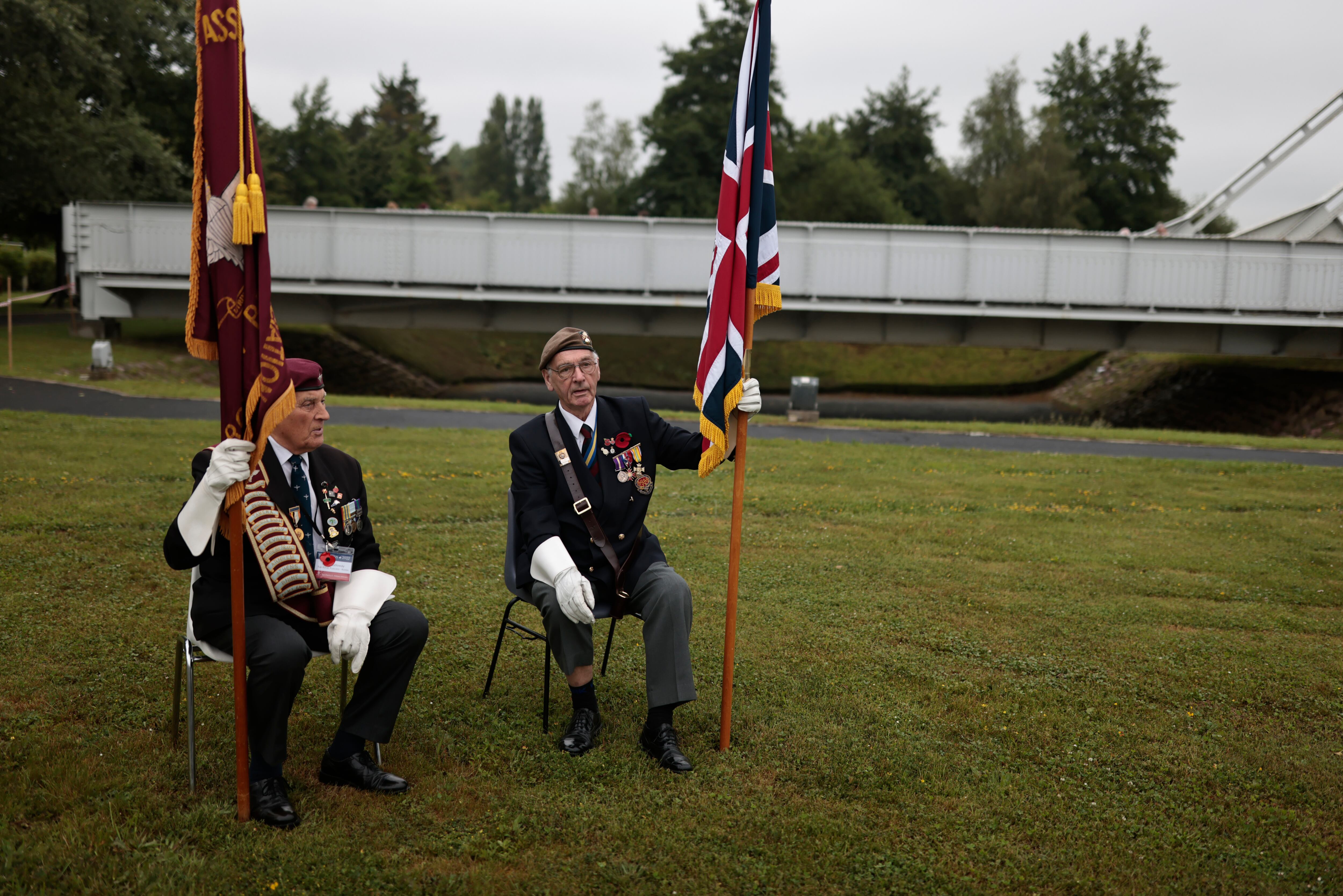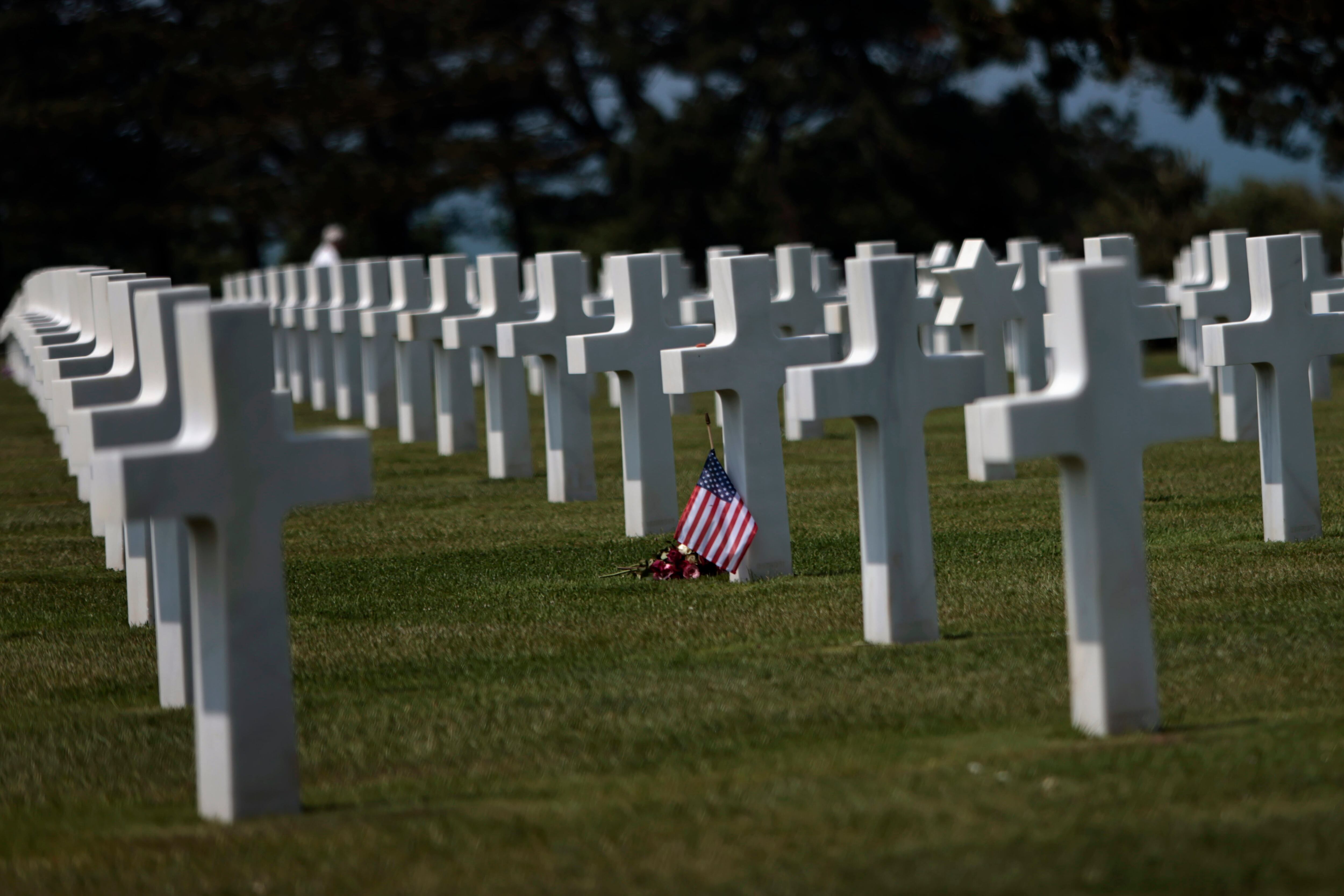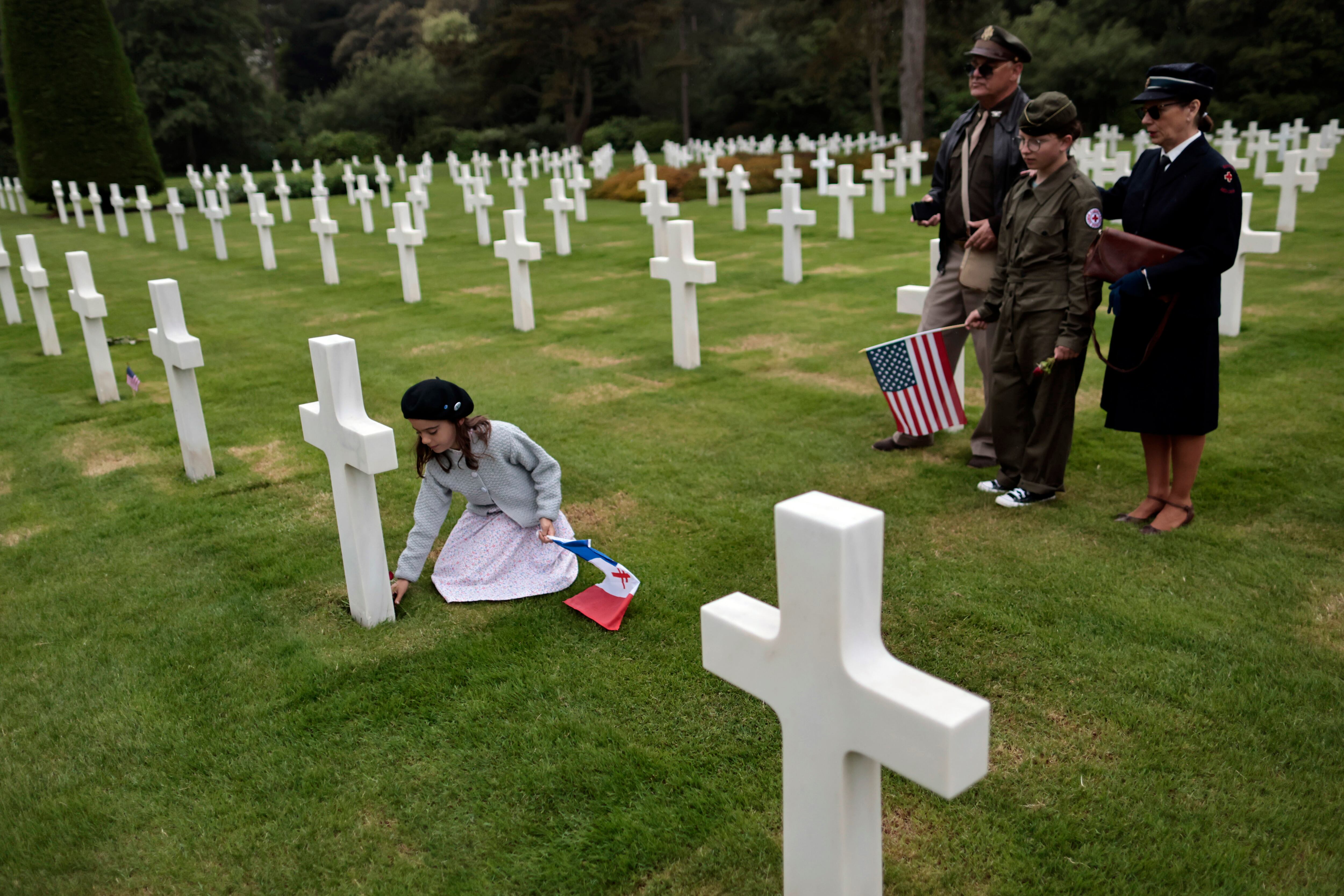 Alice, left, puts a flower, as family members Remy, Dalma and Sylvie, from left to right, look on, in the 1944 headstones of the US cemetery of Colleville-sur-Mer, Normandy, Saturday, June, 4, 2022. (Jeremias Gonzales/AP)British veterans attend the ceremony at Pegasus Bridge, in Ranville, Normandy, Sunday, June, 5, 2022. (Jeremias Gonzalez/AP)World War II history enthusiasts pay respect in the US cemetery of Colleville-sur-Mer, Normandy, Saturday, June, 4 2022. (Jeremias Gonzales/AP)World War II history enthusiast Arnauld Villalard marks respect on a headstone in the US cemetery of Colleville-sur-Mer, Normandy, Saturday, June, 4 2022. (Jeremias Gonzales/AP)General view of headstones in the US cemetery of Colleville-sur-Mer, Normandy, Saturday, June, 4 2022. (Jeremias Gonzales/AP)General view of headstones in the US cemetery of Colleville-sur-Mer, Normandy, Saturday, June, 4 2022. (Jeremias Gonzales/AP)General view of headstones in the US cemetery of Colleville-sur-Mer, Normandy, Saturday, June, 4 2022. (Jeremias Gonzales/AP)General view of headstones in the US cemetery of Colleville-sur-Mer, Normandy, Saturday, June, 4 2022. (Jeremias Gonzales/AP)British veteran Peter Kent of the Royal Navy arrives to the ceremony at Pegasus Bridge, in Ranville, Normandy, Sunday, June, 5, 2022. (Jeremias Gonzalez/AP)British veteran Richard Forrester of the Kings Royal Rifle Corps arrives in a British Taxi Charity for Military Veterans at the ceremony at Pegasus Bridge, in Ranville, Normandy, Sunday, June, 5, 2022. (Jeremias Gonzalez/AP)British veteran Bill Gladen arrives in a British Taxi Charity for Military Veterans to the ceremony at Pegasus Bridge, in Ranville, Normandy, Sunday, June, 5, 2022. (Jeremias Gonzalez/AP)British veterans Roy Maxwell and Mary Scott arrive in a British Taxi Charity for Military Veterans to the ceremony at Pegasus Bridge, in Ranville, Normandy, Sunday, June, 5, 2022. (Jeremias Gonzalez/AP)