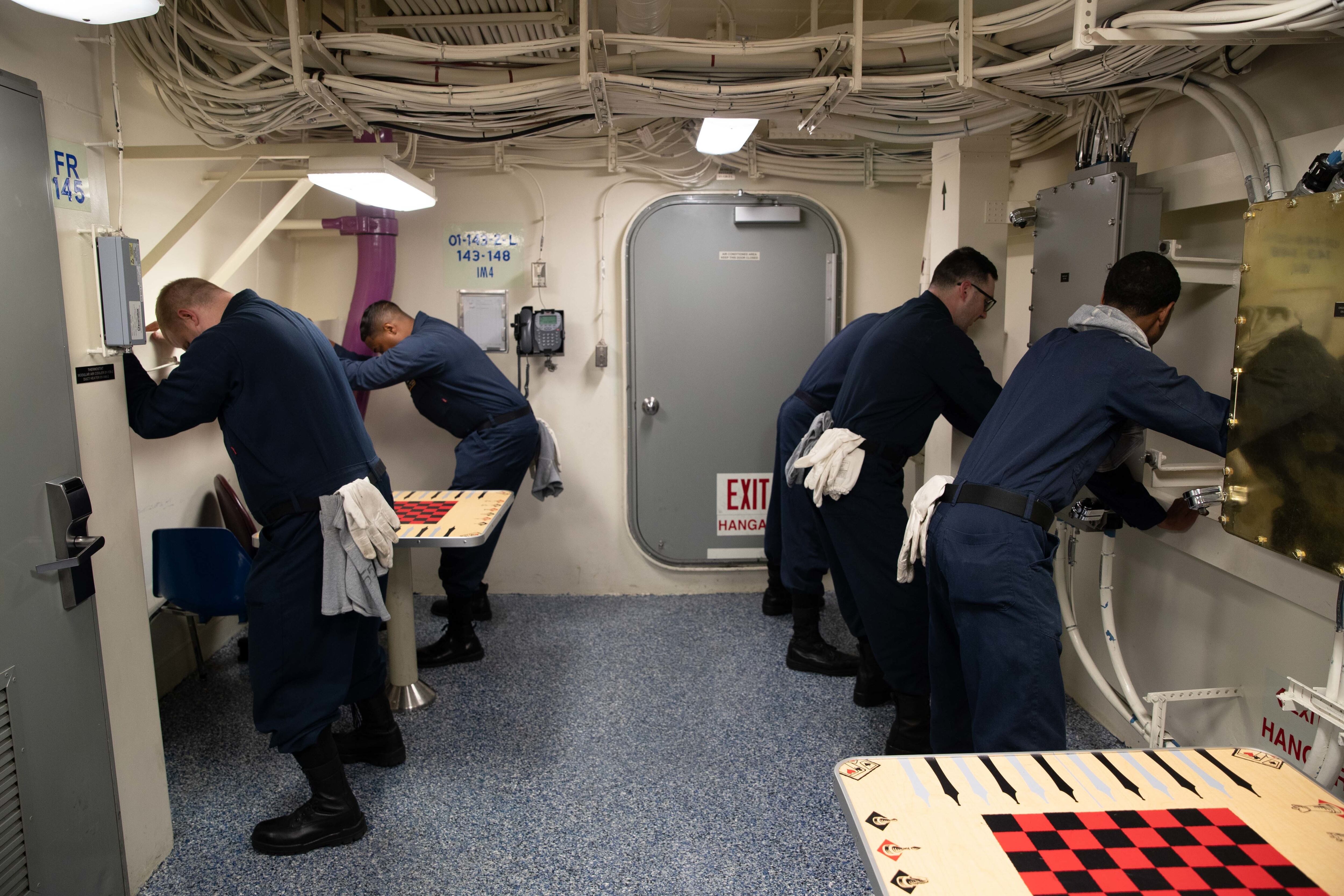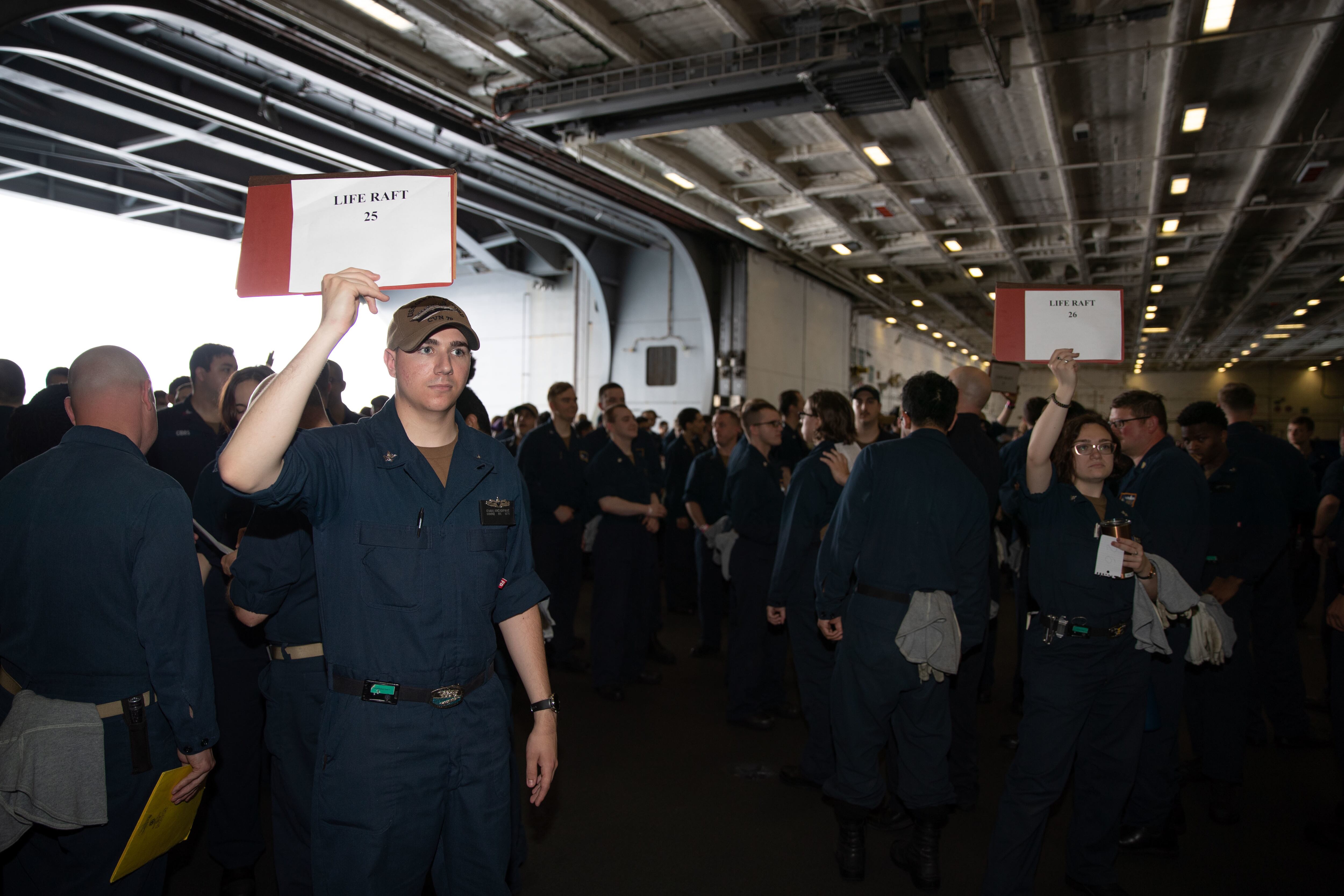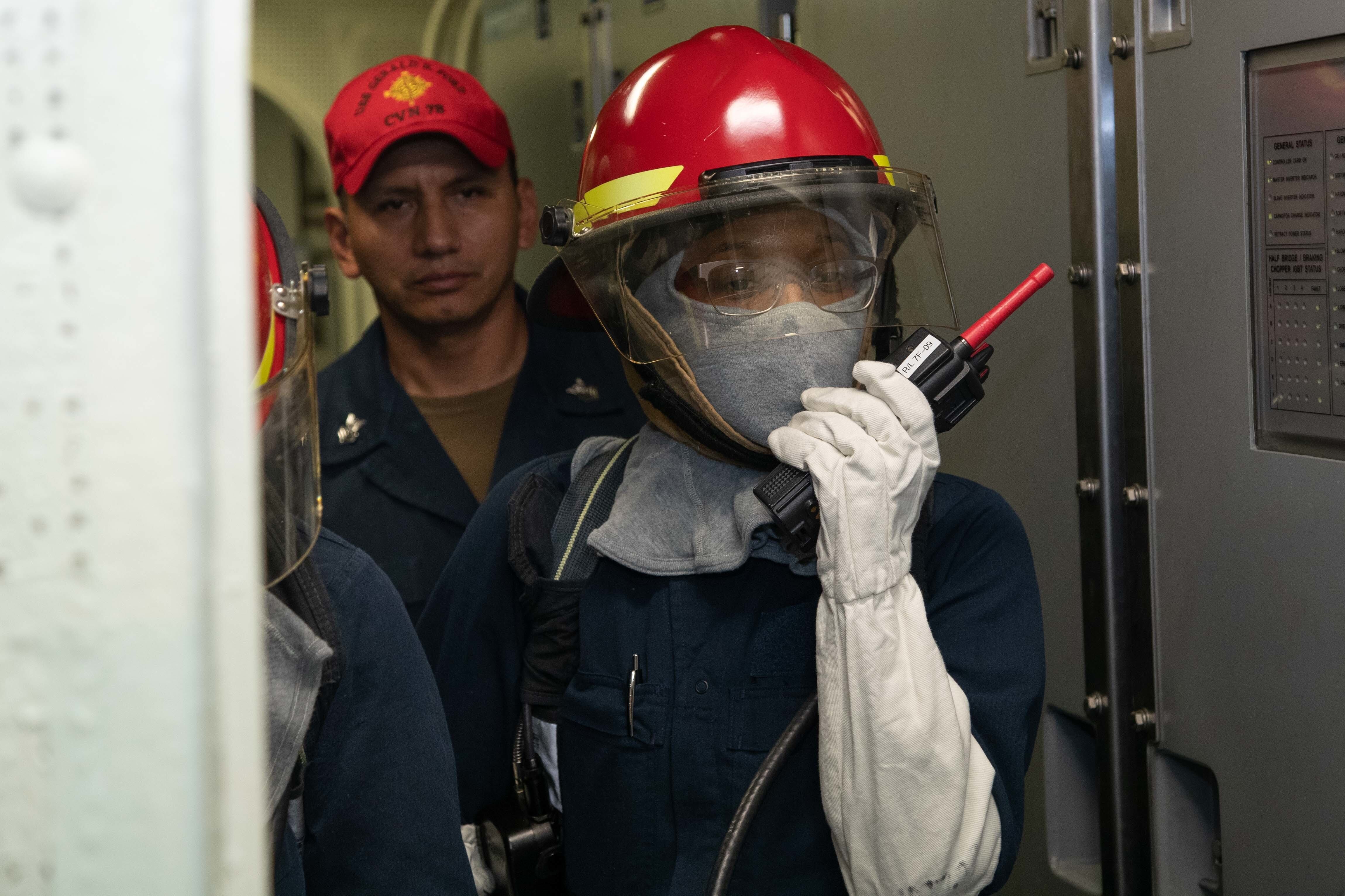 The aircraft carrier USS Gerald R. Ford (CVN 78) completes the first scheduled explosive event of Full Ship Shock Trials while underway in the Atlantic Ocean, June 18, 2021. The U.S. Navy conducts shock trials of new ship designs using live explosives to confirm that our warships can continue to meet demanding mission requirements under harsh conditions they might encounter in battle. MC3 Riley B. McDowell/US Navy.Sailors assigned to USS Gerald R. Ford (CVN 78) muster to their respective life raft stations during an abandon ship training evolution in the ship's hangar bay, June 8, 2021. Ford is underway in the Atlantic Ocean conducting Full Ship Shock Trials (FSST). The U.S. Navy conducts shock trials of new ship designs using live explosives to confirm that our warships can continue to meet demanding mission requirements under harsh conditions they might encounter in battle. MC3 Angel Thuy Jaskuloski/US Navy.Logistics Specialist 2nd Class Jinaki Boston, from Baltimore, assigned to USS Gerald R. Ford's (CVN 78) supply department, reports a simulated casualty during a general quarters drill, June 9, 2021. Ford is underway in the Atlantic Ocean conducting Full Ship Shock Trials (FSST). The U.S. Navy conducts shock trials of new ship designs using live explosives to confirm that our warships can continue to meet demanding mission requirements under harsh conditions they might encounter in battle. MC3 Brett Walker/US Navy.Sailors assigned to USS Gerald R. Ford (CVN 78) brace for shock during a general quarters drill, June 8, 2021. Ford is underway in the Atlantic Ocean conducting Full Ship Shock Trials (FSST). The U.S. Navy conducts shock trials of new ship designs using live explosives to confirm that our warships can continue to meet demanding mission requirements under harsh conditions they might encounter in battle. MC3 Angel Thuy Jaskuloski/US Navy.Sailors assigned to USS Gerald R. Ford's (CVN 78) supply department brace for shock during a general quarters drill, June 9, 2021. Ford is underway in the Atlantic Ocean conducting Full Ship Shock Trials (FSST). The U.S. Navy conducts shock trials of new ship designs using live explosives to confirm that our warships can continue to meet demanding mission requirements under harsh conditions they might encounter in battle. MC3 Brett Walker/US Navy.