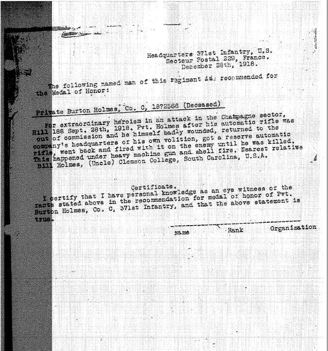 Stowers' nomination for Medal of Honor. "If [Stowers is] the criteria for a Medal of Honor, and Holmes is on that same level, was that recommendation downgraded based on racism?" said Knapp. Courtesy of Jeff Gusky.Burton Holmes' nomination for Medal of Honor. There are no known photographs of Holmes. We don't know what he looked like or what his history is. We know he was illiterate; he signed his draft card with an "x," according to Gusky. Courtesy of Jeff Gusky.Burton Holmes' Medal of Honor nomination was disapproved. Holmes' story is important whether or not the medal is upgraded, said Gusky, because it represents what it means to be an American. Courtesy of Jeff Gusky.