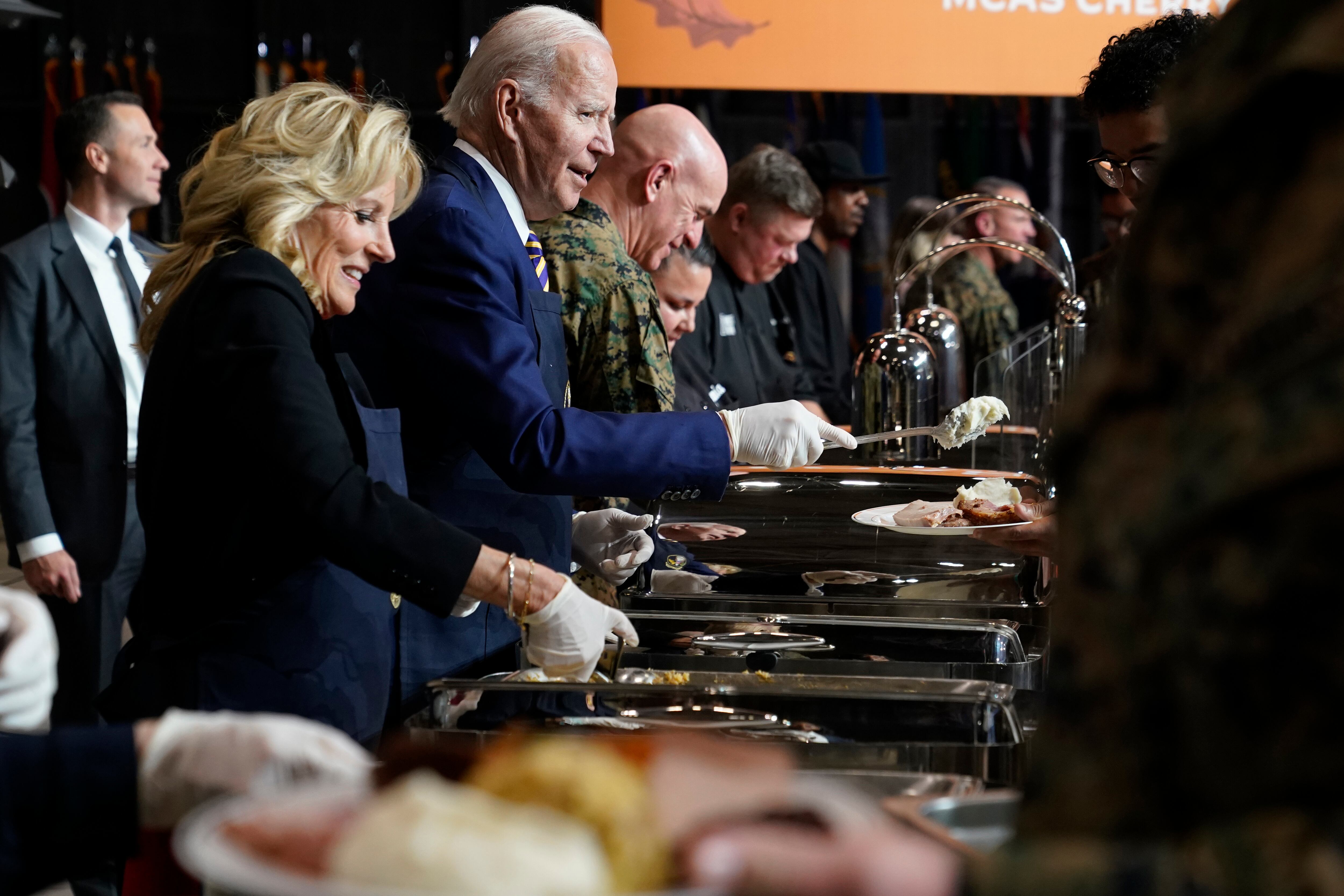 Later, Biden helped serve heaping mounds of mashed potatoes, while the first lady doled out stuffing.