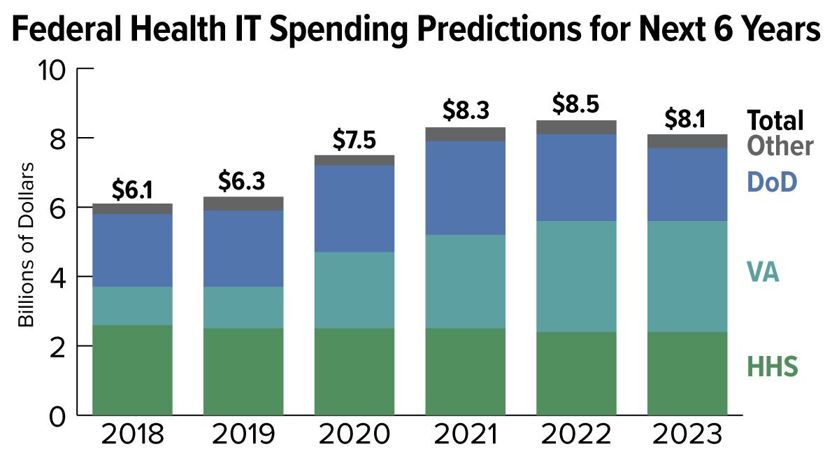 However, according to the report, federal health IT spending will increase to $8.1 billion by 2023, in part due to a predicted increase in Medicare enrollment by that time, and Veterans Affairs will make up the largest chunk of that spending at 40 percent.