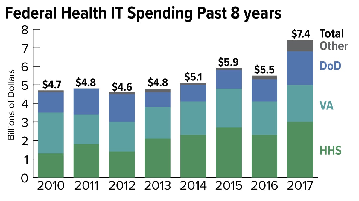 As of 2017, HHS represented just over 40 percent of the federal government’s approximately $7.5 billion health IT spend. VA represented 27 percent, and DoD came in third at 24 percent.