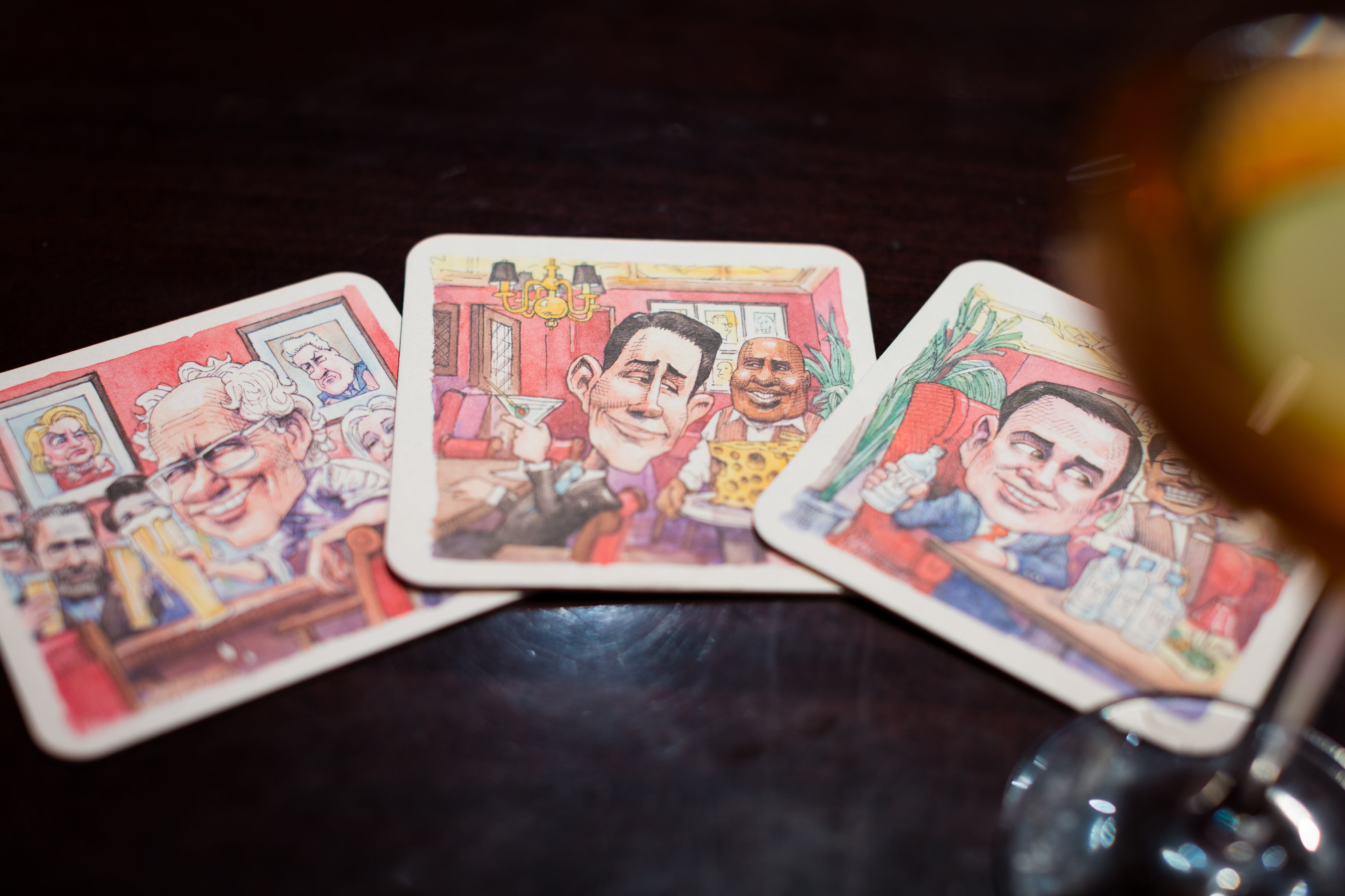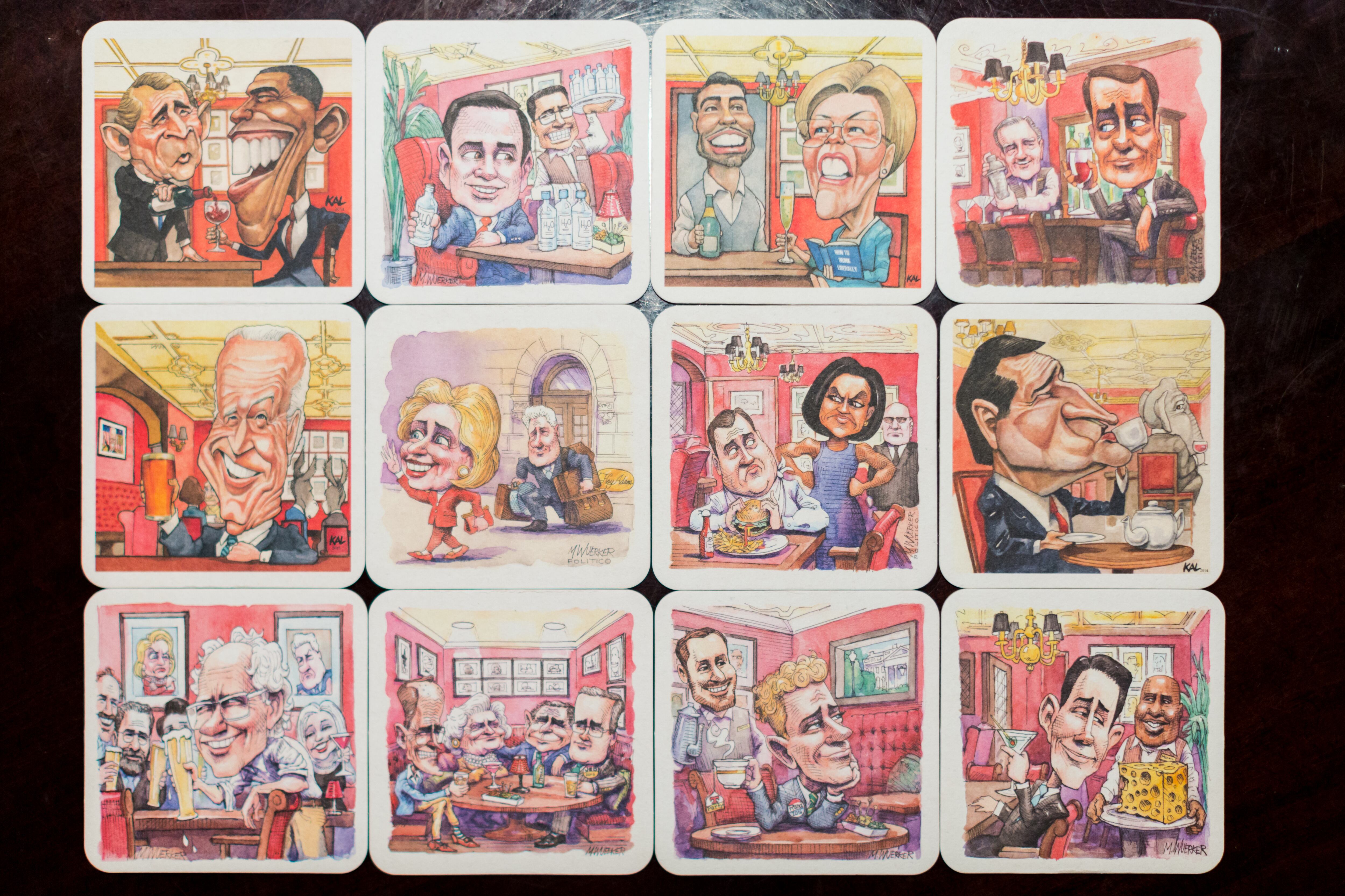 The Off The Record bar at The Hay-Adams hotel is introducing collectible coasters featuring caricatures of some of 2016's presidential hopefuls. No word on whether they have started referring to bottled water as "The Rubio."