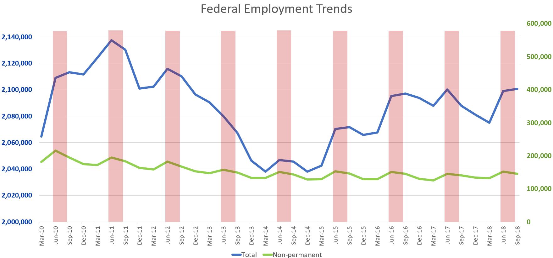 Some of that change can be accounted for by the influx of college and high school graduates entering the federal workforce after finishing school. The federal workforce under 30 years old spikes an average of 10 percent between March and June.