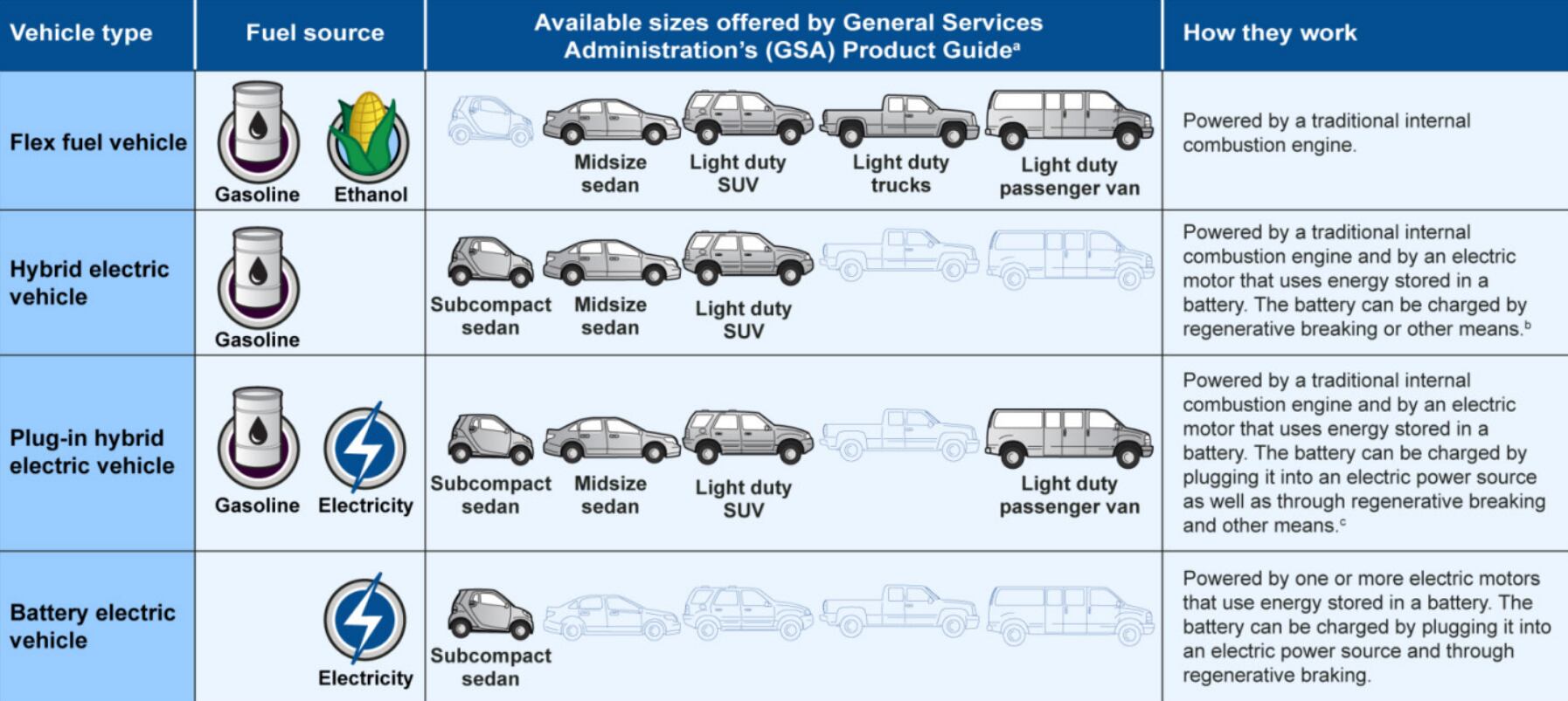 “For example, GSA offered one 4x2 hybrid-electric sport-utility vehicle and one 4x4 plug-in hybrid-electric sport-utility vehicle in fiscal years 2017 and 2018. In fiscal year 2019, additional vehicles have been added. While these options are considered low greenhouse-gas-emitting vehicles, an agency official told us that they have a variety of other characteristics that may make them less desirable for certain missions — for example, they may cost significantly more than other options to acquire, or, in the case of the plug-in, rely on charging infrastructure that the agency may not have in the location where the vehicle is needed.”