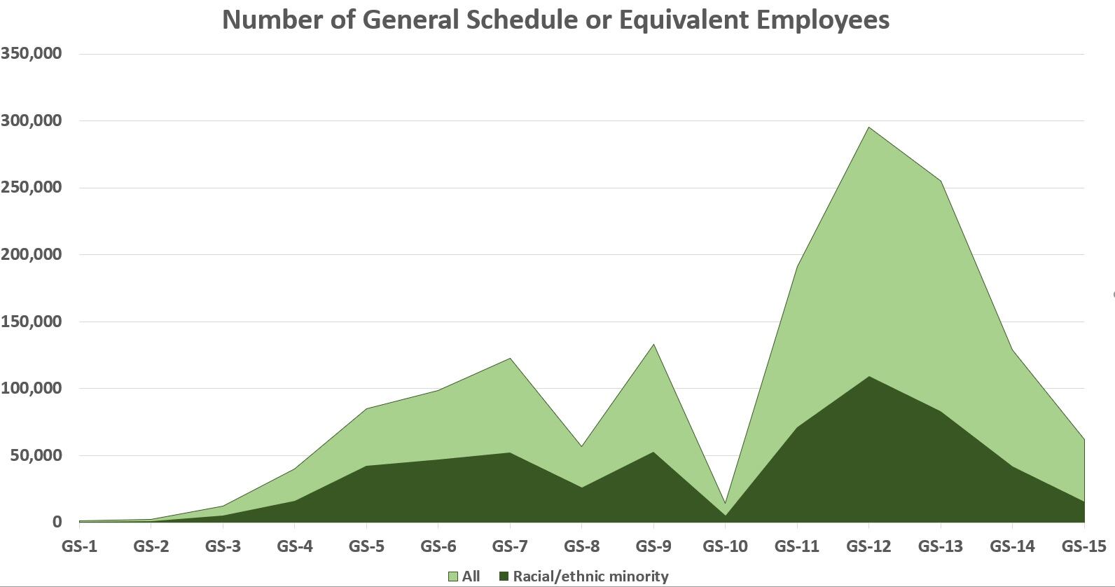 But the percentage of racial and ethnic minorities in the workforce begins to drop in the GS-10 to 15 ranks, with such minorities filling only 24.9 percent of GS-15 positions.