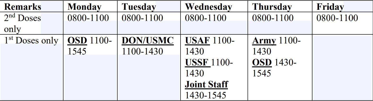 Vaccines will be administered at the Pentagon Library and Conference Center, with morning hours dedicated to second doses and the rest of the day dedicated to first doses.