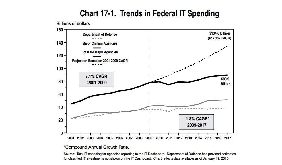 Budget documents note agency spending on IT has slowed in recent years, drop from 7.1 percent annually from 2001 to 2009 to a 1.8 percent average between 2009 and 2017. The administration credits "achievements in improving the efficiency of how funds are spent on IT" with bringing spending down without lessening the quality of IT operations.