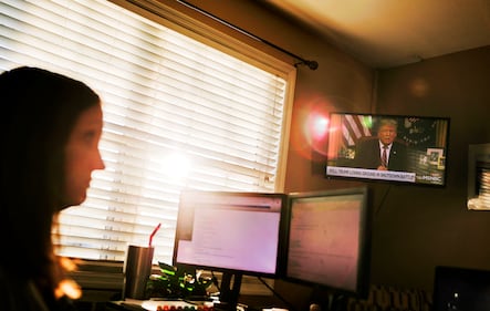 Just back from maternity leave following the birth of her second child, Katie Barron works at home for a private company not connected to the government, but her husband is a National Weather Service meteorologist forced to work without pay because his job is classified as essential.