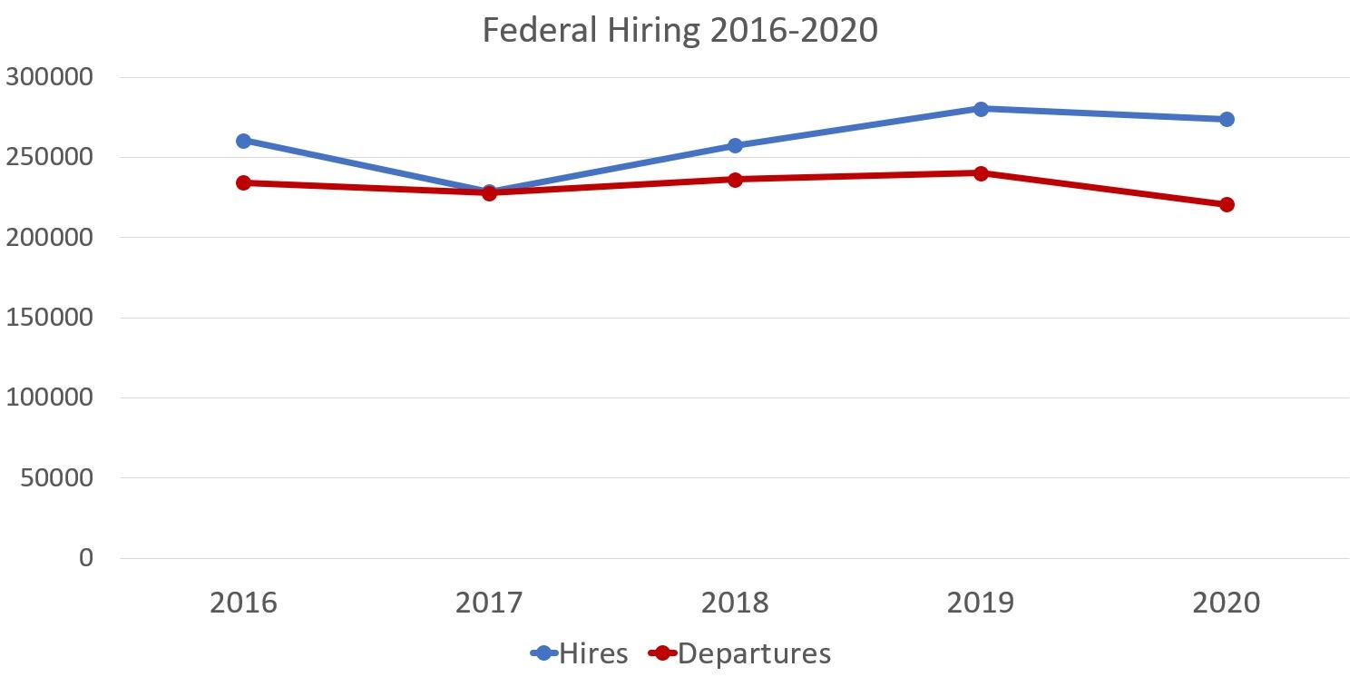 But despite these efforts to bring in more employees the federal government did not see a marked uptick in hiring in 2020.