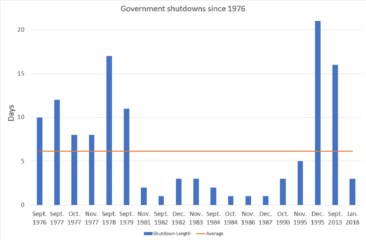 The 2018 shutdown was also shorter than the government average of six days established by the pattern of longer shutdowns in the mid- to late-1970s and shorter ones throughout the 1980s. Shutdowns are also significantly less common than they were in those decades.