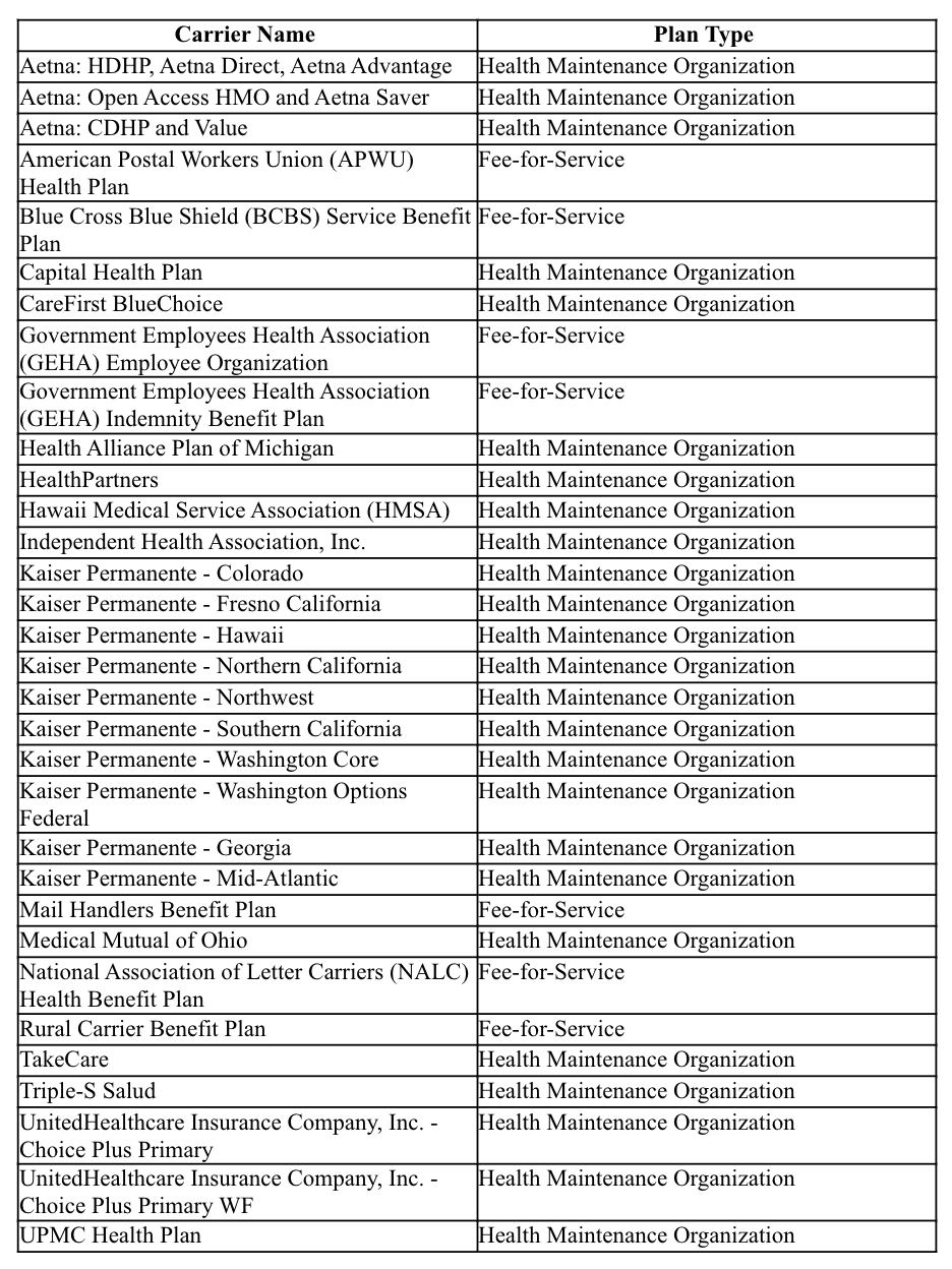 For now, there isn’t much involvement in that process by feds, but they will begin receiving more information over the next few months. In the meantime, this preliminary list of carriers may give some an inkling of the choices postal employees have to make later this year.