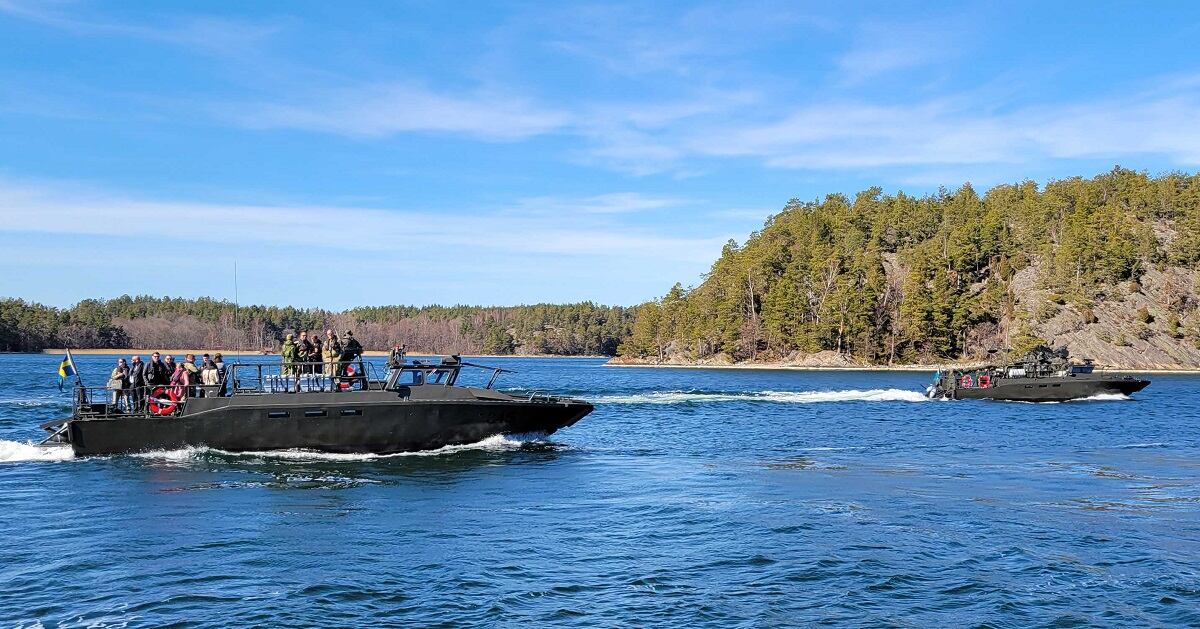 The convoy of boats, led by the angular, gray camouflage corvette, wound through the forested island archipelago — past a minesweeper ship and a looming black submarine, cargo ships and underwater mine blasts. Two Blackhawk helicopters buzzed the procession; a pair of Gripen fighter jets soared overhead.