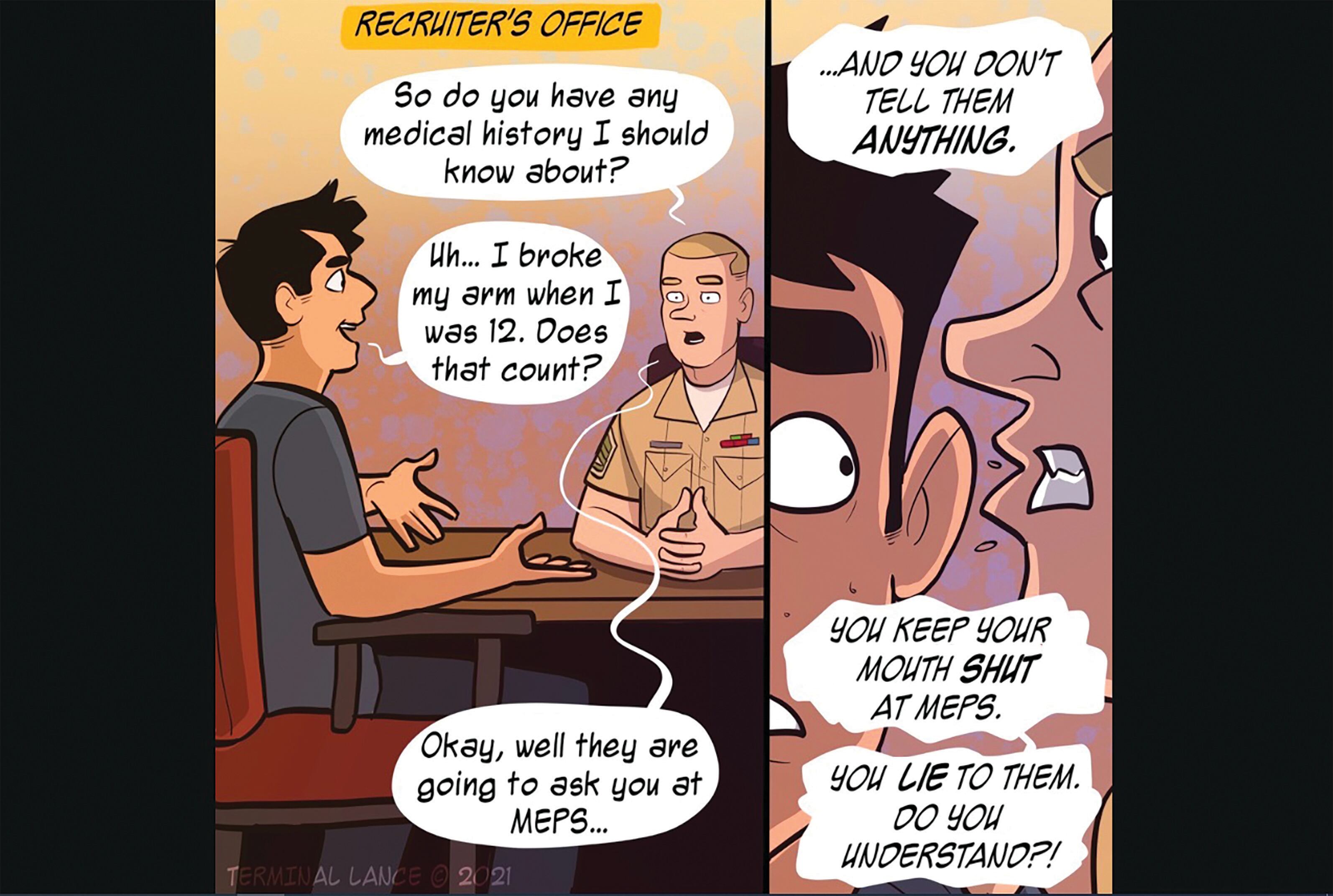“You never had asthma. You never had ADHD,” the Navy recruiter said. “You broke your leg when you were six? “Don’t talk about it.”