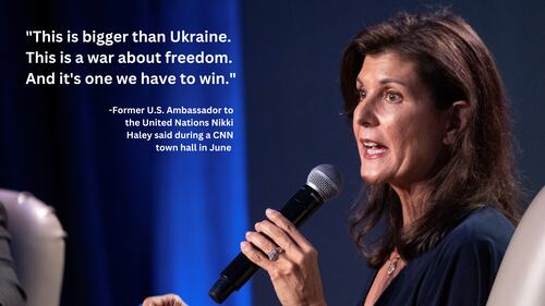 The former UN ambassador and former governor of South Carolina has made the case for supporting Ukraine, without putting American troops on the ground. She has also said she supports giving cluster munitions to Ukraine.
