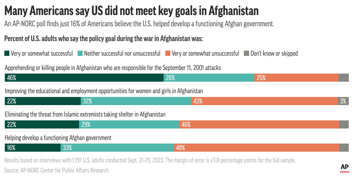 The poll from the Pearson Institute for the Study and Resolution of Global Conflicts and The Associated Press-NORC Center for Public Affairs Research comes two years after the U.S. pulled out of Afghanistan in August 2021 and the Taliban returned to power. The war was started to go after the masterminds of the Sept. 11, 2001 terrorist attacks and the Taliban who allowed them to use Afghan territory. It ended in frantic scenes of Afghans and Americans desperately trying to get on one of the last flights out of Kabul.