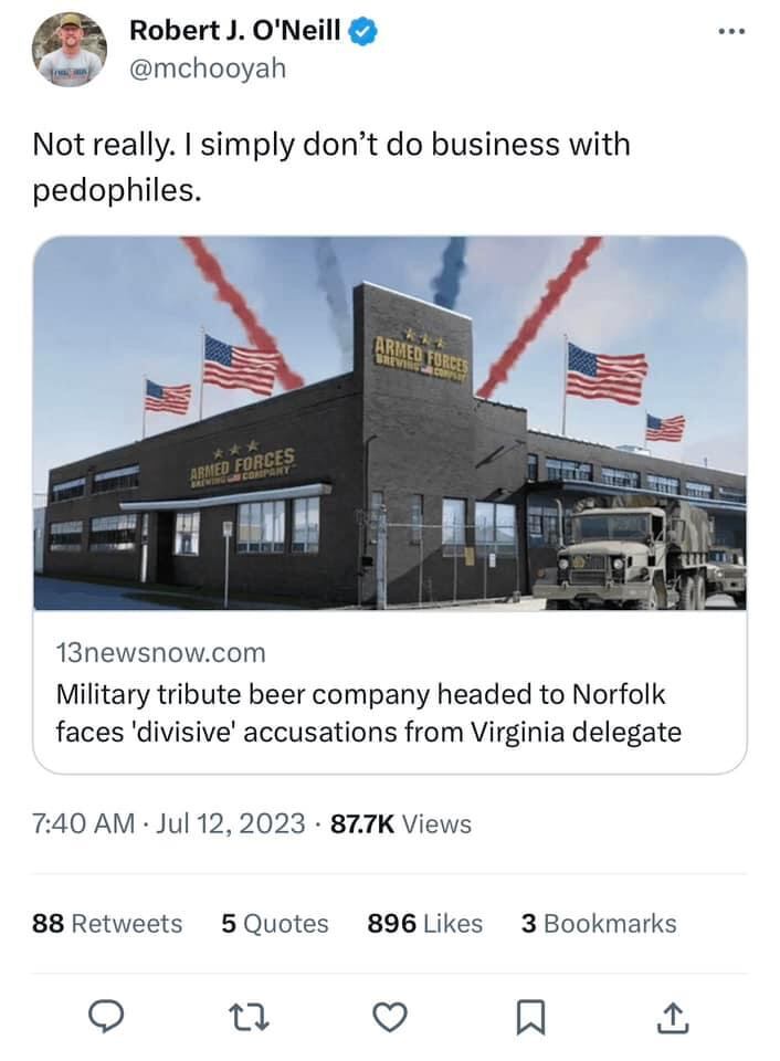 Armed Forces is different. It’s the anti-craft beer, craft brewery, as conservative as Coors but with a $14 six-pack price tag. The company’s branding and its leaders cater to a specific niche, mocking hipster, “woke” culture and appealing to Fox News viewers. Beal’s social media posts show him wearing a “Trust in Beer, Not in Government” shirt, supporting indicted former President Donald Trump and mocking President Joe Biden. It chose as its brand ambassador Robert O’Neill, the SEAL Team 6 member who claims to have killed Osama bin Laden.