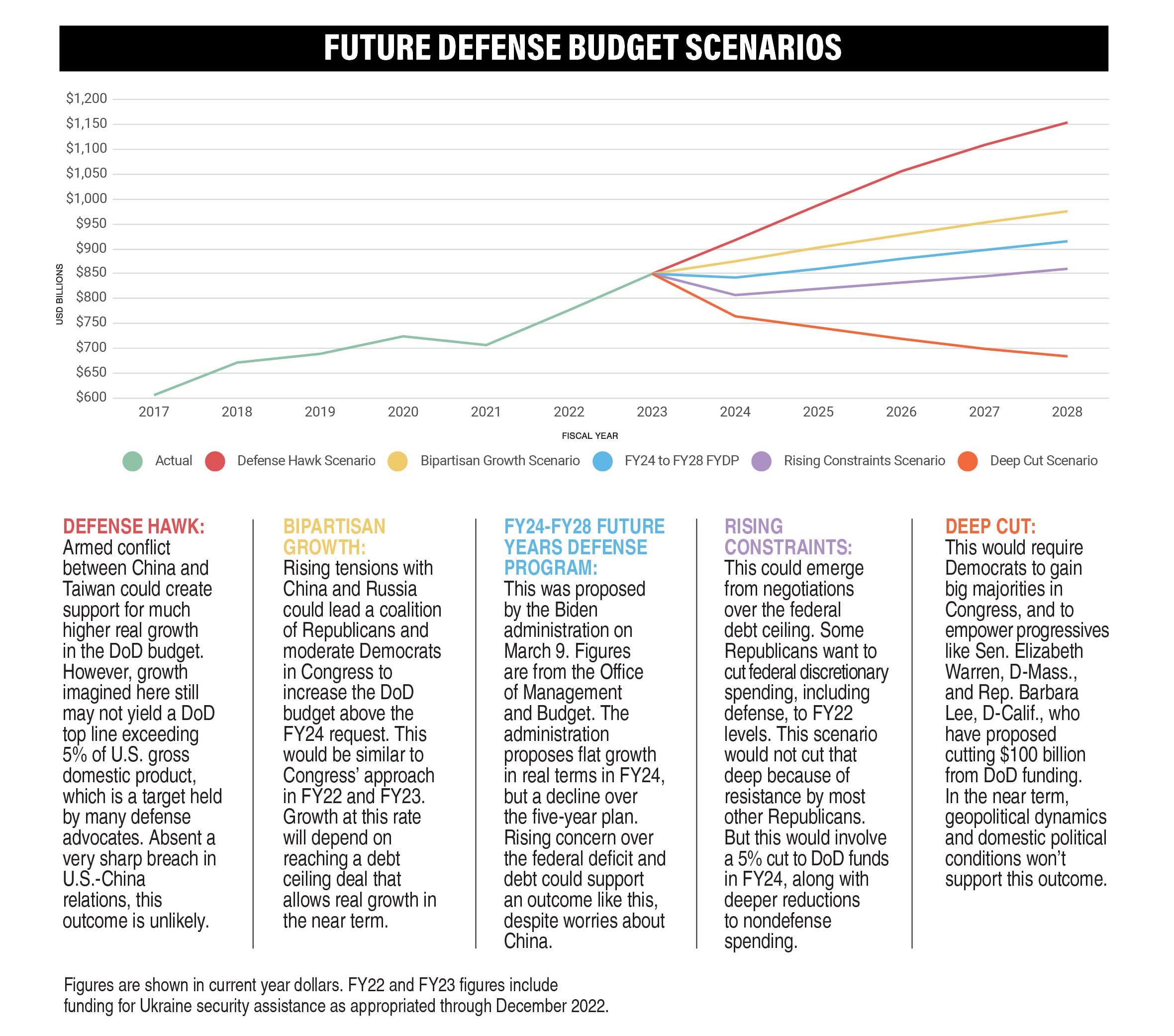 All of this would seem to indicate the need to sustain or increase America’s defense spending, despite fiscal headwinds. The management consulting firm Oliver Wyman poses some scenarios for how the Defense Department’s budget may unfold over the next several years.
