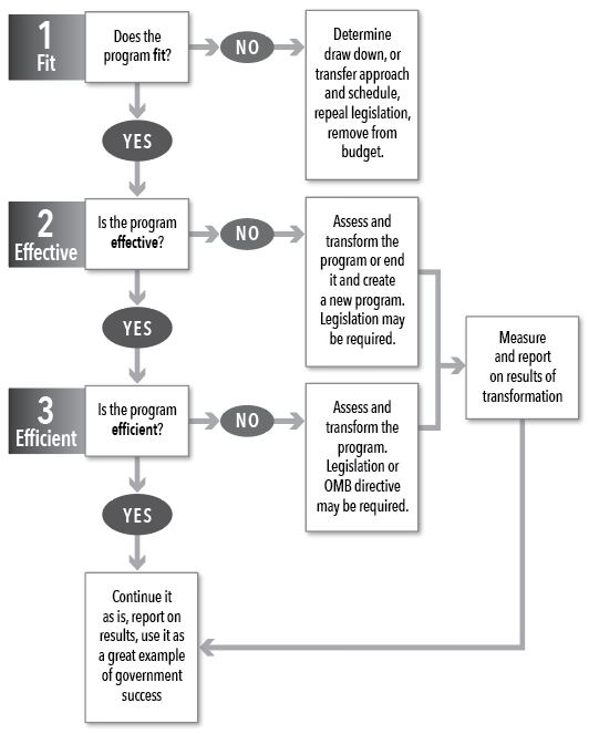 If a program is assessed as “fit” you can then address efficiency and effectiveness. If a program is “unfit” then steps must be taken to eliminate it, reduce it, or change it in some way. In the case of duplication and overlap, additional analysis may be necessary to determine which program should best house or manage the function. A draw or ramp down action may be needed, legislation repealed or revised, and the program removed from the budget as well as any OMB or GAO program inventory.