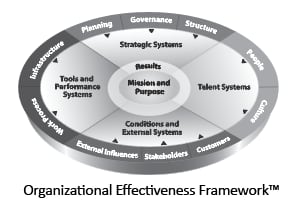 Assessing effectiveness and efficiency is best done using a model such as the OE Framework depicted here. It is essential to not only determine efficiency and effectiveness but to also understand its root cause, whether it is or is not hitting the mark. Since there are many contributing factors to organizational effectiveness, a holistic and rigorous approach is necessary to ensure completeness and validity of the assessment.