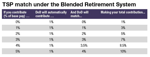 For those new to the military, after you have served for 60 days, a TSP account will be created, and automatic deductions of 3 percent of your basic pay start going to your TSP. (You can change that amount, but by law, you will automatically be re-enrolled at 3 percent each year.) DoD kicks in 1 percent automatically, but will contribute up to an additional 4 percent of base pay to match your contributions. So if you contribute 5 percent, the DoD match brings it to 10 percent.
