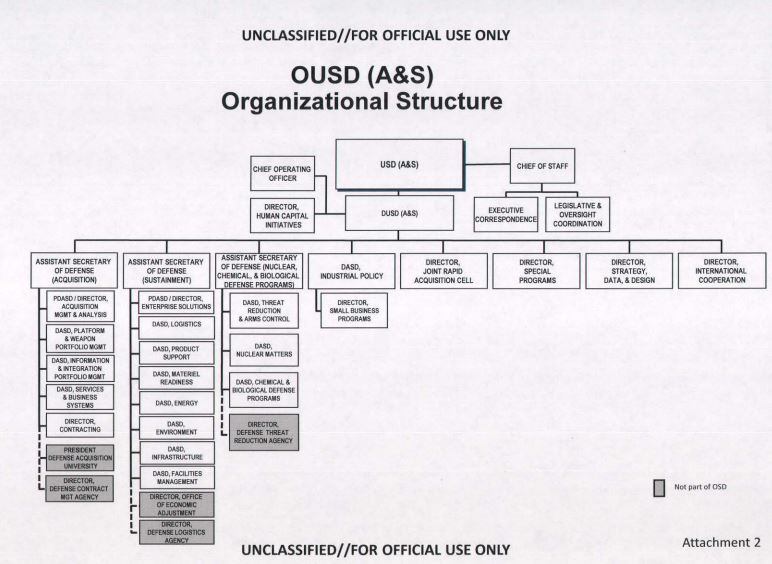 The 17-page document lays out the organizational charts for the offices of the Undersecretary of Defense for Acquisition and Sustainment and the Undersecretary of Defense for Research and Engineering, as well their responsibilities. The two offices were created Feb. 1, when Congress required the former Acquisition, Technology and Logistics (AT&L) office to be divided. A potential organization chart was published in August, but the new document features significant changes, particularly on the R&E side.