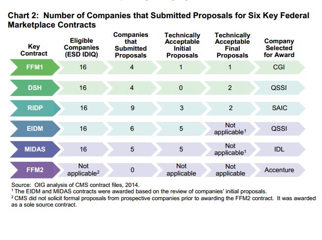 "CMS did not perform thorough reviews of contractor past performance when awarding two key contracts," the report continues. "CMS also made contracting decisions that may have limited the number of acceptable proposals for much of the key federal marketplace work."