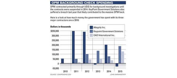 Data from USASpending.gov show a sharp decline in contracting dollars going to USIS (and parent company Altegrity) in 2015, after OPM decided to not renew its contract. KeyPoint and CACI International picked up the majority of those contracts and are now the two largest background investigators for the federal government.